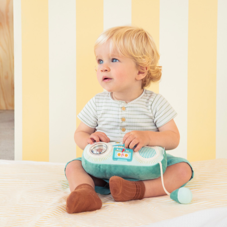 Du hörst Radio Joe, Musik ohne Unterbrechung! Mit diesem niedlichen Joe the Dragon Stoffradio haben Kinder Spaß daran, 7 fröhliche Klänge aus 9 Monaten zu entdecken. Seine Soundbox mit EIN/AUS-Funktion garantiert stundenlanges Spielen und musikalisches Entdecken! Eine großartige Möglichkeit, das Gehör anzuregen! Aber das ist noch nicht alles, dieses Frühlernspielzeug bietet auch Aktivitäten, die man mit den Fingerspitzen manipulieren kann. Einer der Lautsprecher, in Form eines Löwenkopfes, enthält eine Rassel mit farbigen Kugeln, die das Auge anzieht und Neugier weckt. Und um die Lautstärkeanpassung zu simulieren, schiebe einfach die blaue Taste in die Mitte: so viel Spaß! Indem Sie dieses sanfte kleine Radio erkunden, entdeckt Ihr Kind eine Vielzahl von Materialien, die Sie dazu einladen, seine Berührung zu stimulieren. Und das Detail, das den Unterschied macht: ein flexibles Mikrofon, das mit einer Baumwollschnur verbunden ist, perfekt zum Singen und Begleiten der Melodien! Dein Kind greift es, improvisiert seine ersten Konzerte und wird zu einem echten Radiomoderator. Mit diesem Klangspielzeug lassen Sie Ihre Fantasie freien Lauf! Und weil wir Überraschungen lieben: Indem man den mit einer retro "Music Box"-Kassette illustrierten Stoff zusammenfaltet, erscheint eine versteckte Szene. Jack, der Löwenmusiker, hat seine Gitarre herausgeholt, um die Melodien des Radios zu begleiten und das Babyzimmer in eine echte musikalische Bühne zu verwandeln! Außerdem sehen wir vor dem Falten des Stoffes seinen Freund, den Papagei, bereit, ihn beim Backgroundgesang zu begleiten! Dank seines Baumwollgriffs praktisch zu tragen, wird dieses Frühlernspielzeug schnell zum Star der Spielzeit. Macht euch bereit, es wird auf Radio Joe schwingen!
