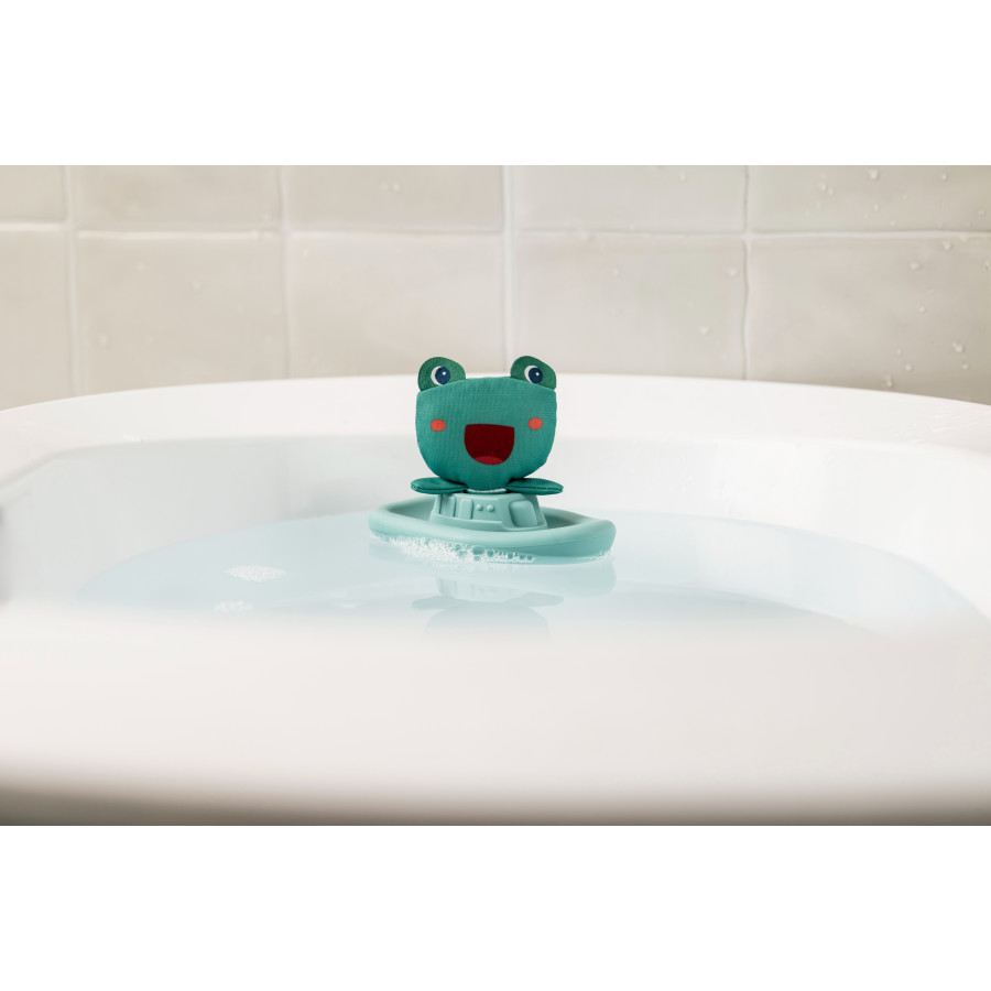 Alle einsteigen! James nimmt dich mit zum Segeln! Geh auf wilde Erkundungen mit James, dem Frosch, an Bord seines niedlichen schwimmenden grünen Bootes! Geeignet für Babys ab 6 Monaten, stimuliert dieses Badespielzeug das Sehvermögen, die motorischen Fähigkeiten und die Vorstellungskraft von Kleinkindern. Bequem in seinem kleinen Silikonboot eingebaut und in seinem besten Seemannshemd gekleidet, träumt James bereits davon, die schönsten Teiche und Seerosen zu erreichen! Während seiner Reise liebt er es, lustige Spritzer zu machen und Babys zu platschen... Und er hat eine tolle Zeit, dieser Schlingel! Also springen wir in der Badewanne, planschen und lachen los... Der Moment des Waschens wird dann zu einem echten Genuss für die ganze Familie, gleichbedeutend mit lustigen Marinegeschichten! Der Stofffrosch passt ins Boot und lässt sich leicht abnehmen: das Baby kann sich vorstellen, dass Legs ins Wasser springt! Man kann den Charakter in der Waschmaschine bei 30° waschen und das Boot in der Spülmaschine. Ob zum Waschen oder zum Spaß im Wasser an einem heißen Tag – dieses Lilliputianische Wasserspiel verspricht lange Stunden voller Spaß! Dann... Lass uns ein paar Sprünge machen!