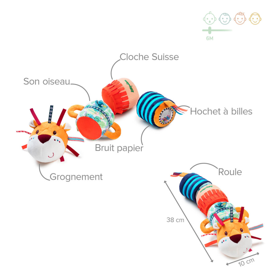 Der Löwe ist los! Jack hilft Ihrem Kind, sein Gehör und seine Feinmotorik zu schulen. Dank der Klettverschlüsse kann es die einzelnen Glieder schnell auseinandernehmen und wieder zu einer Rolle zusammensetzen. Jedes Teil macht ein anderes Geräusch und ist mit weichem, farbigem Stoff überzogen. Das sind 4 Rasseln in einer – die perfekte Unterhaltung für Ihr Baby!