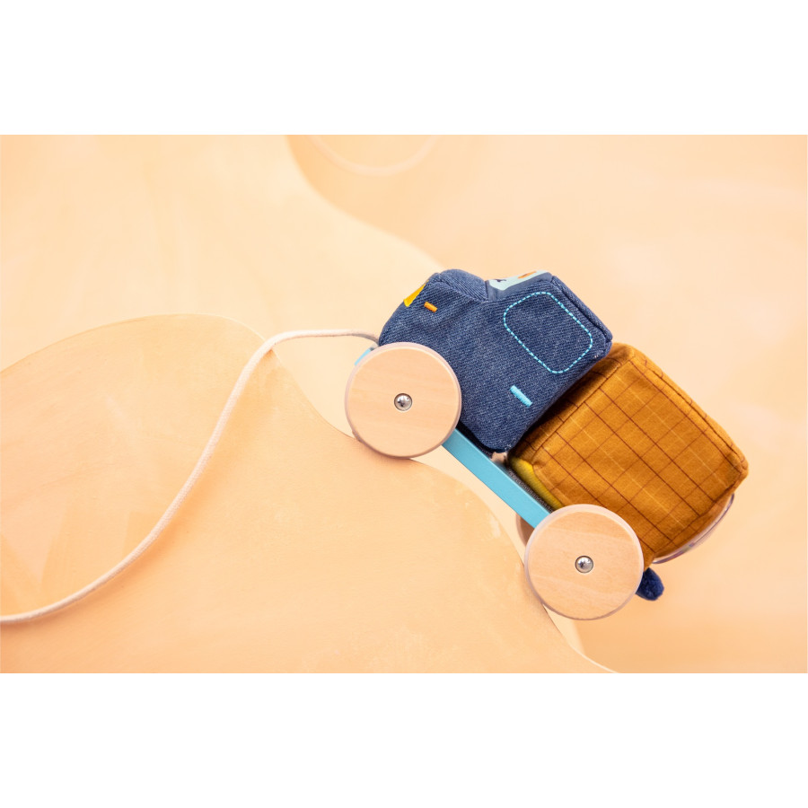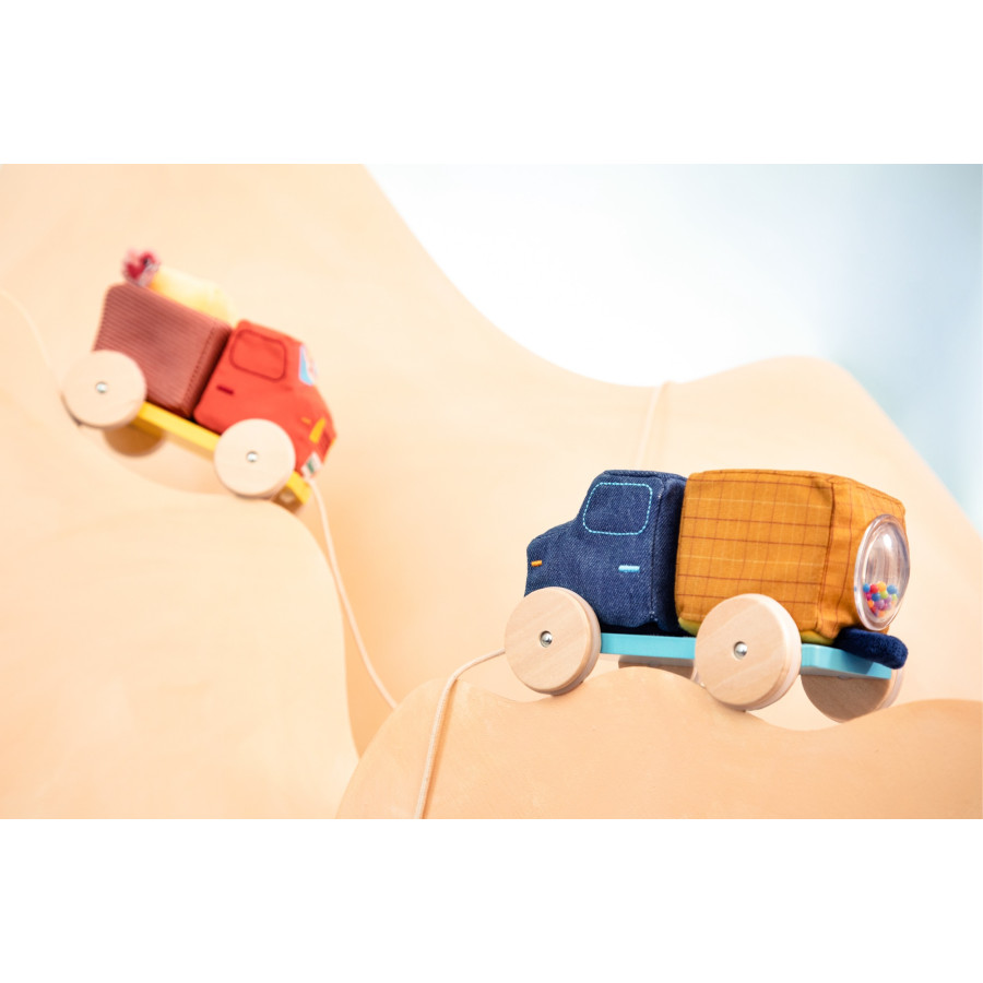 Geräusche und Aktionen sind angesagt: Blöcke vom Sockel nehmen, um verschiedene Geräusche zu hören, unter den Betonmischer hinten am LKW ziehen, um den Kreisel aktiv zu sehen, am Seil ziehen, um den LKW zu neuen Baustellen rollen zu lassen, ....