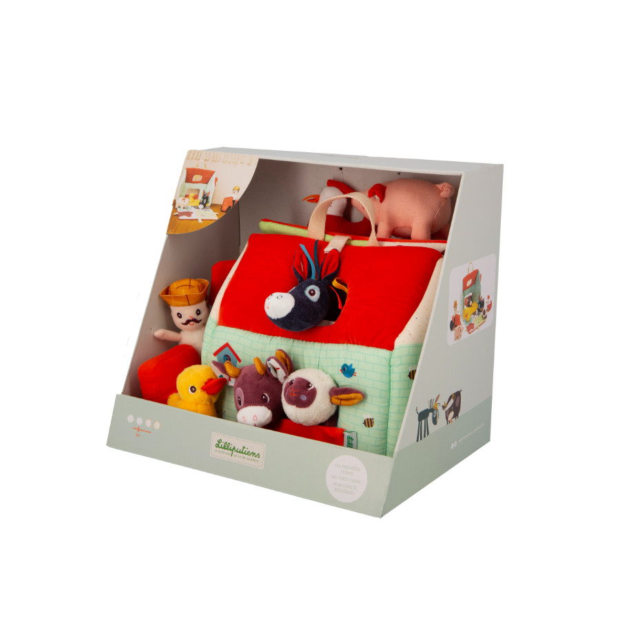 Die Tiere leben harmonisch auf dem ersten Bauernhof für die Kleinen! Dieser Stoffbauernhof mit seinen 8 Accessoires ist das ideale Spielzeug für Babys ab 18 Monaten. Er ist lustig, steckt voller einzigartiger Details und Überraschungen, die es zu entdecken gilt, und regt die Fantasie und Motorik der Kleinsten an. Aus diesem Stoffbauernhof kommen die Stars der Scheune und des Hühnerhofs, eines bunter als das andere! Unter diesen kleinen Plüschtieren finden sich: Simon, das gefräßige Schwein, Rosalie, die unerschrockene Kuh, Yvon, das flauschige Schaf, Paulette, die Glucke, Ignace, der Esel mit der rebellischen Strähne, und Gaspard, die kleine Ente. Mit ihnen erfindet Ihr Kind verrückte Geschichten auf dem Bauernhof und freut sich, ihre Namen zu lernen! Diese fröhliche Menagerie erhält jeden Tag Besuch vom Bauern Fons, der auf seinem knallroten Traktor sitzt. Welche Überraschung wird er heute Morgen entdecken, wenn er die Tiere begrüßt? Die kleinen Hände der Kinder tauchen dann durch die Öffnungen auf der Suche nach den Tieren des Bauernhofs: Durch das Dach oder durch den Zaun, alle machen sich aus dem Staub! Aber das ist noch nicht alles: Dieser Stoffbauernhof lässt sich öffnen und gibt den Blick auf weite Flächen frei. Die Lebensräume der verschiedenen Tiere werden sichtbar, und Ihr Kind lernt in seinem eigenen Tempo, jedes Tier seinem Lebensraum zuzuordnen. In der Scheune ist natürlich immer Platz, und zu mehreren macht das Spielen noch mehr Spaß! Ein weiterer Vorteil dieses Bauernhof-Spielzeugs sind die Befestigungen und der Griff am Dach, mit denen man alles verstauen und das Spielzeug überallhin mitnehmen kann. Der Bauernhof ist eine anregende Welt, in der man sich Zeit nimmt, die Welt im Kontakt mit der Natur zu entdecken. Dieser Bauernhof aus Stoff besteht aus Polyester, dessen Füllung aus recyceltem Polyester besteht, und ist bei 30 °C vollständig in der Maschine waschbar.