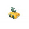 Herr Eule muss zum Flughafen. Joe springt flugs in sein Taxi, um ihn hinzubringen. Dieses weiche Auto ist ideal für kleine Händchen. Einfach ein Stück zurückziehen, und schon fährt das Auto los!