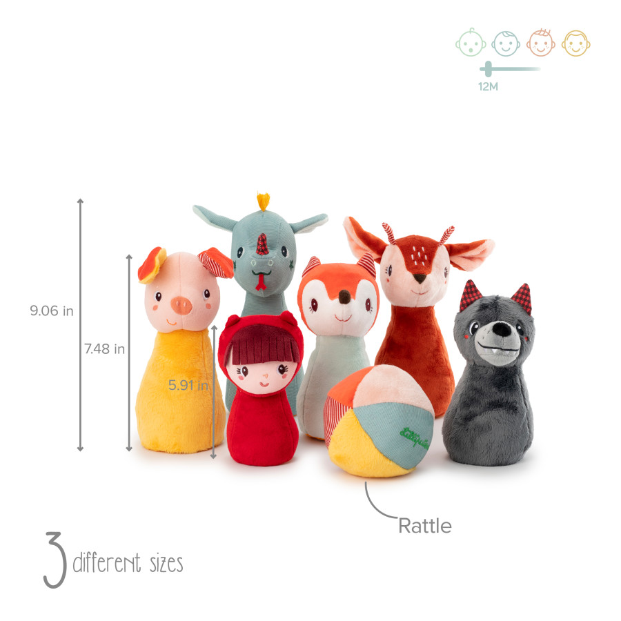 Wer kann diese fröhliche Bande von Waldfreunden mit einem Wurf umwerfen? Dieses bunte Bowling-Spiel besteht aus 6 weichen Pins und einem weichen Stoff-Rasselball. Um drinnen ohne Schäden zu spielen und ein zukünftiger Bowling-Star zu werden.