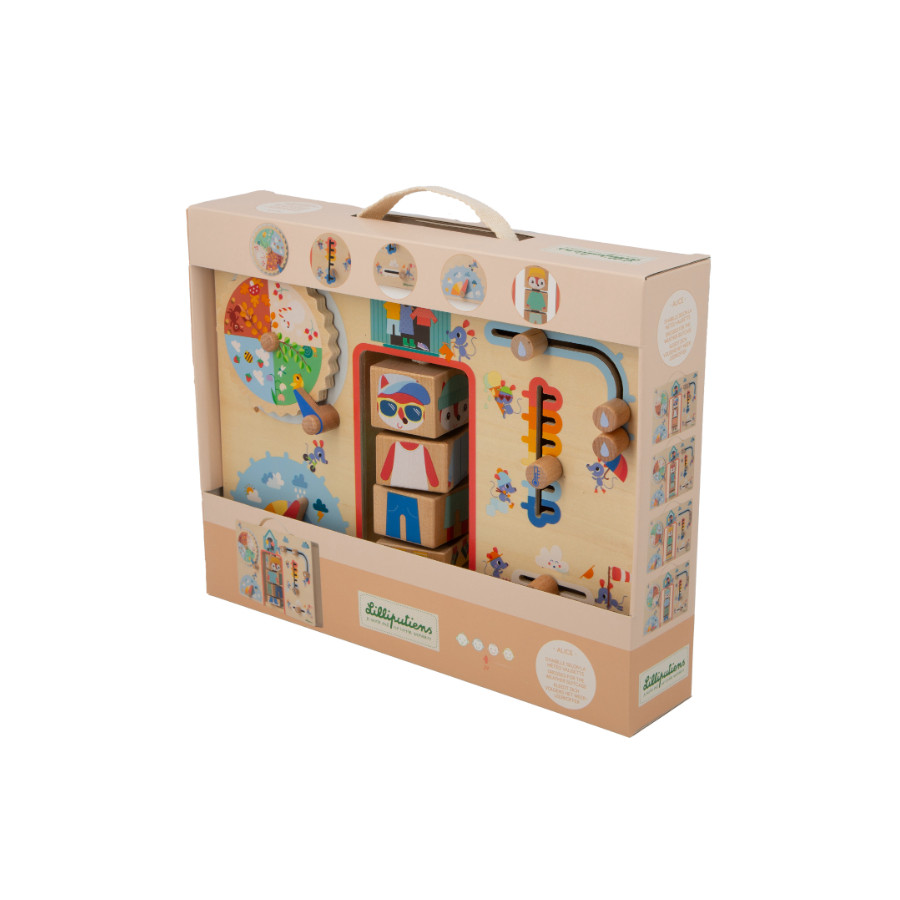 Dieses hölzerne Panel in Form eines Koffers ermöglicht es dem Kind, das Wetter auf spielerische Weise zu entdecken. Alice der Fuchs, bestehend aus 4 Holzblöcken, kann gedreht werden, um sich entsprechend den Wetterbedingungen anzuziehen. Durch Drehen der Blöcke lernt das Kind, je nach Jahreszeit, Intensität des Regens, Wind und Temperatur die geeignete Kleidung auszuwählen und fördert so seine Autonomie und sein Verständnis der Welt um sich herum.