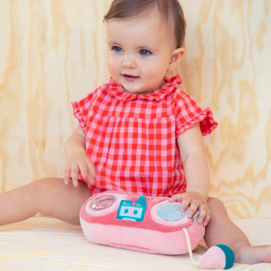This is Radio Jeanne, get ready for a maximum of hits! With their pretty Jeanne the cat fabric radio, children discover 7 joyful sounds, from 9 months. Thanks to its sound box with ON/OFF function, this soft radio promises hours of play and musical discovery! A great way to stimulate hearing! But that's not all, this early learning toy offers activities to explore with little hands. One of the speakers, in the shape of a cat's head, offers a rattle with colorful balls that attracts baby's eye and curiosity. And to pretend to turn up the volume, just slide the blue button in the center: so much fun! By manipulating this funny little radio, your child discovers various textures to stimulate his touch. And its little extra? A flexible microphone connected to the radio by a cotton cord, perfect for accompanying the melodies! Your child catches it, improvises his first concerts and thinks he is a real radio host. With this sound toy, let your imagination run wild! And because we love surprises: by folding down the fabric illustrated with a retro "Music Box" cassette, your child discovers a hidden scene. Jeanne invited her friends the mice to have tea and enjoy this good atmosphere! Easy to carry thanks to its cotton handle, this early learning toy quickly becomes the star of playtime. Careful... it's going to swing on Radio Jeanne!