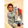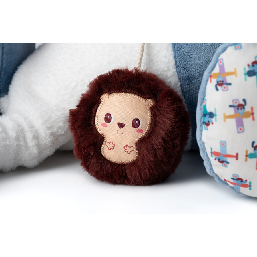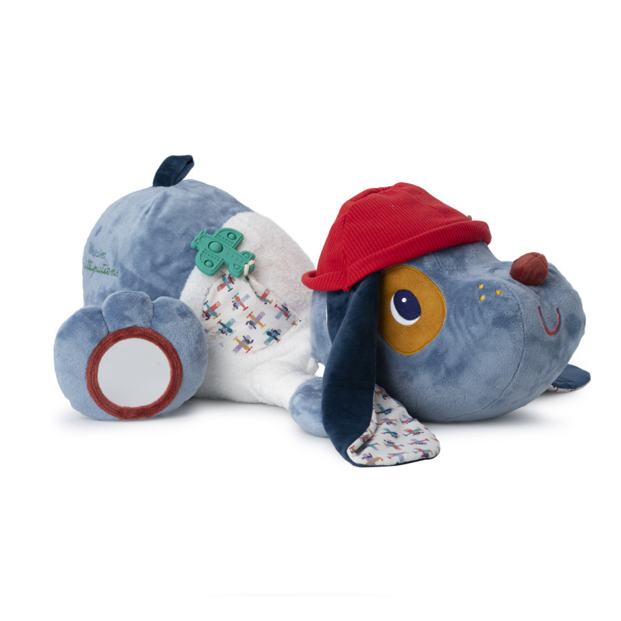 With his slightly fluffy appearance, Jules the dog is simply irresistible. He offers a captivating tactile experience with every stroke. With a variety of textures and activities, the child will discover a universe of sensations, thus stimulating their sensory development. Soft fabrics, a teething ring, a popping airplane-shaped game, and many other surprises await exploration. In addition to being decorative, this comforting dog provides hours of stimulating and soothing play.