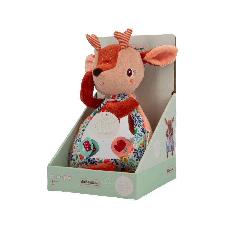 With her magnetic hands, Stella the fawn can cover her eyes to play hide and seek with the child, eliciting laughter and wonder. On her belly, a large mirror invites the child to discover their own reflection, thus stimulating their sensory awareness and self-discovery. On the mirror are 3 labels under which secret illustrations can be found by lifting them.