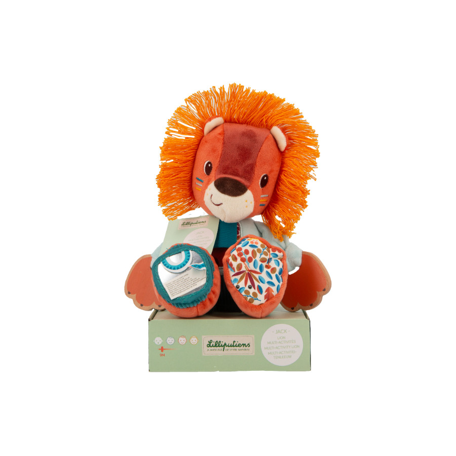 Jack the lion, with his adorable face, has 2 wooden paws that go clap clap with every movement. His furry mane invites petting and tactile exploration. His various activities stimulate the senses of little ones.
