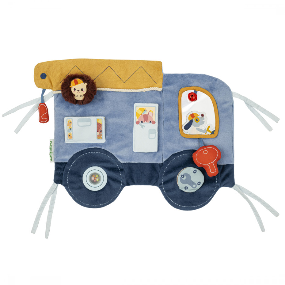 Looking for a toy for the playpen? Jules the dog arrives with his truck, his tools, and his friends! All to stimulate the senses and entertain baby, from 3 months. In total, this fabric activity panel offers 6 activities. At the front of the truck, our handyman dog is present on a mirror to observe himself and with a red bell to ring. Essential to get started, the red key goes "Poo" when you press it: let's go! On the two wheels of the truck, there is a rattle with balls to spin and a flap to lift to discover surprises. In total, 3 flaps are to be opened to reveal all the secrets of this discovery panel. But watch out for the bumps, because Léon the hedgehog could well slide from side to side of the truck during the journey to the construction site! As you will have understood, this early learning toy is on the theme of DIY, because it is one of the passions of our dear Jules ... And soon perhaps, of your baby! Easy to hang on the bars of the playpen or bed thanks to its 4 ties to tie, this Lilliputiens activity panel can also be simply placed on the ground to vary the positions of the little ones during their playtime. With its various visual, tactile or sound surprises, its varied and colorful materials, this early age toy is a real asset for baby's awakening. It develops its fine motor skills, its sight, its hearing, but also its reflection, its curiosity and its imagination: what DIY mission are our friends going on? This fabric panel measures 41.5 x 30 cm, it is hand washable. Let's go, little ones!