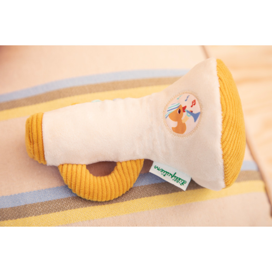 Baby discovers music! With this trumpet rattle, your little one gently awakens his senses from the age of 3 months. Like our friend Gaspard the duck, always up for fun, your child will enjoy imitating a real musician by pretending to play the trumpet! To awaken your hearing, this rattle makes cheerful "Toot" and crumpled paper sounds and also offers different textures and small colored rings to encourage tactile exploration. Too practical, a handle adapted to small hands is provided so that the child can easily grab the instrument. By simply waving the plush rattle or replicating the gestures of the older ones, your child enjoys a complete sensory experience! In addition to stimulating the senses of little ones, this soft rattle encourages imagination and active imitation. Enough to entertain them for long hours of play! Thanks to its practical size of 15 x 9 x 15 cm, this plush rattle is perfectly suitable for babies. If you're looking for an original developmental toy, you've come to the right place! Surface washable and made of 76% recycled materials, this rattle is made of polyester. Give him his very first Lilliputian musical instrument now!