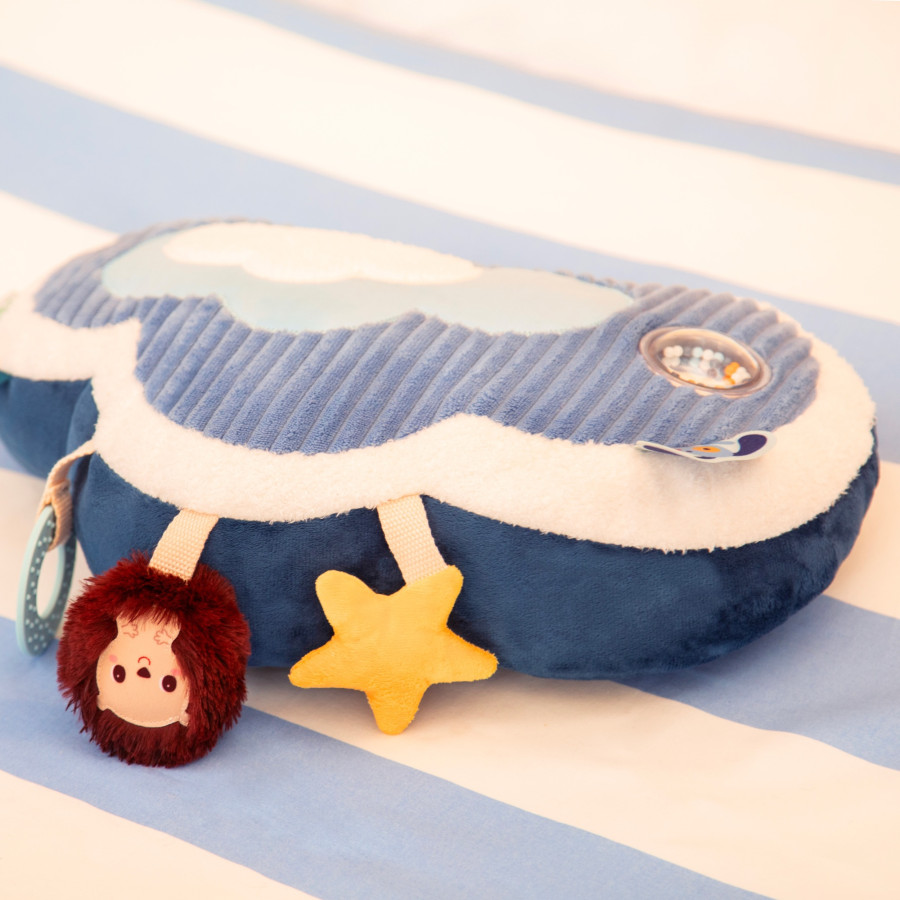 Head for the clouds with Jules the dog! This tender cloud-shaped activity cushion accompanies baby in his first discoveries: textures, sounds, shades of colour... Jules the dog, an outstanding aviator, flew to the clouds with his faithful companion Léon the hedgehog. Together, they invite baby to embark on a gentle journey... Head for the sky and its wonders! Lying on his stomach, baby sits comfortably and starts exploring this cushion with his curious little hands. When handling the cushion, baby encounters different materials that stimulate his touch. In his discovery, he has fun with the rattle with the colored marbles, he watches them move and listens to the soft noise they make. Jules the dog is waiting for him not far from there to say hello! Then, baby sees Léon the hedgehog, clinging to the cushion, who offers him a very soft rattle to shake. What a joy to make it ring! Then, a yellow star catches his attention: as he crumples it, baby discovers the sound of paper crackling between his fingers. And to relieve his small gums, he grabs the teething ring within reach. Its textured surface provides a gentle massage that soothes teething tension, while providing a pleasant sensory experience. The colorful labels invite her little fingers to explore even more. Each activity stimulates his senses and strengthens his muscle tone! In its dimensions 7 x 36 x 23 cm, this early learning toy ensures moments of play filled with softness and discovery! Ready to embark with Jules and Léon?