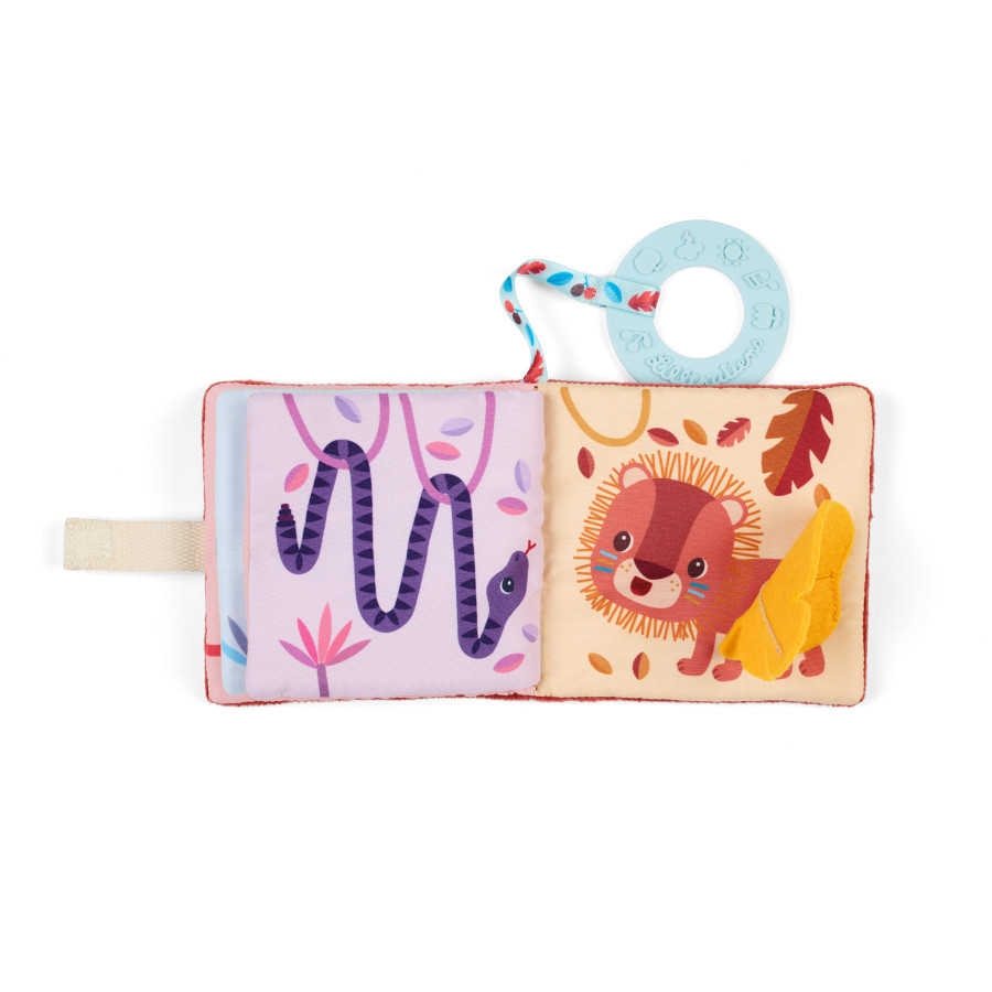 A very soft picture book for baby! Designed for toddlers from 6 months, the Jack the Lion picture book invites baby to dive into the heart of the jungle and awaken all his senses. In its practical format of 10 x 10 cm, this fabric book is perfect for moments of discovery and sharing with the family. In this story, Jack, with his flamboyant mane, sets out to meet his jungle friends: parrot, chameleon, elephant, lemur, snake... Each page is an invitation to explore, touch and be amazed. In addition to the colorful illustrations to observe, each page has surprises to explore at your fingertips: varied textures, relief details and soft materials invite tactile discovery. Baby develops his visual acuity and fine motor skills, while enjoying a story that enriches his vocabulary! This is an opportunity for you to teach baby the names of animals! The varied materials offered by this picture book stimulate the sense of touch: look how soft the elephant's ears are! The colorful pages stimulate the eye, while the materials awaken the sense of touch. And to arouse curiosity and promote auditory awakening, the cover contains rustling paper to crackle: a pleasure for little hands! The little extra? A blue teething ring with raised patterns, perfect for relieving gums during teething. Baby can leaf through his picture book or chew on the ring safely. You can hang baby's first picture book with the tape with velcro fastener, so you always have it at hand. This fabric picture book can be surface washed.