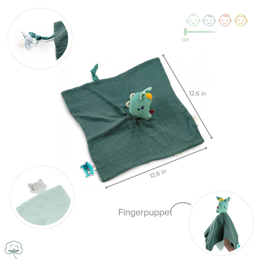 This green organic jersey comforter is just what your little one needs: it will comfort them and be a loyal friend for many years to come. The head serves as a finger puppet and a fabric ties allow for the dummy to be attached. It also boasts a handle and a customisable name tag.