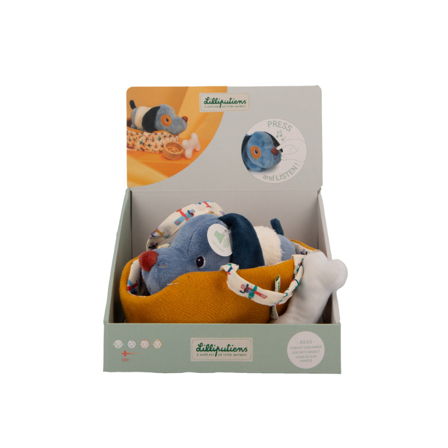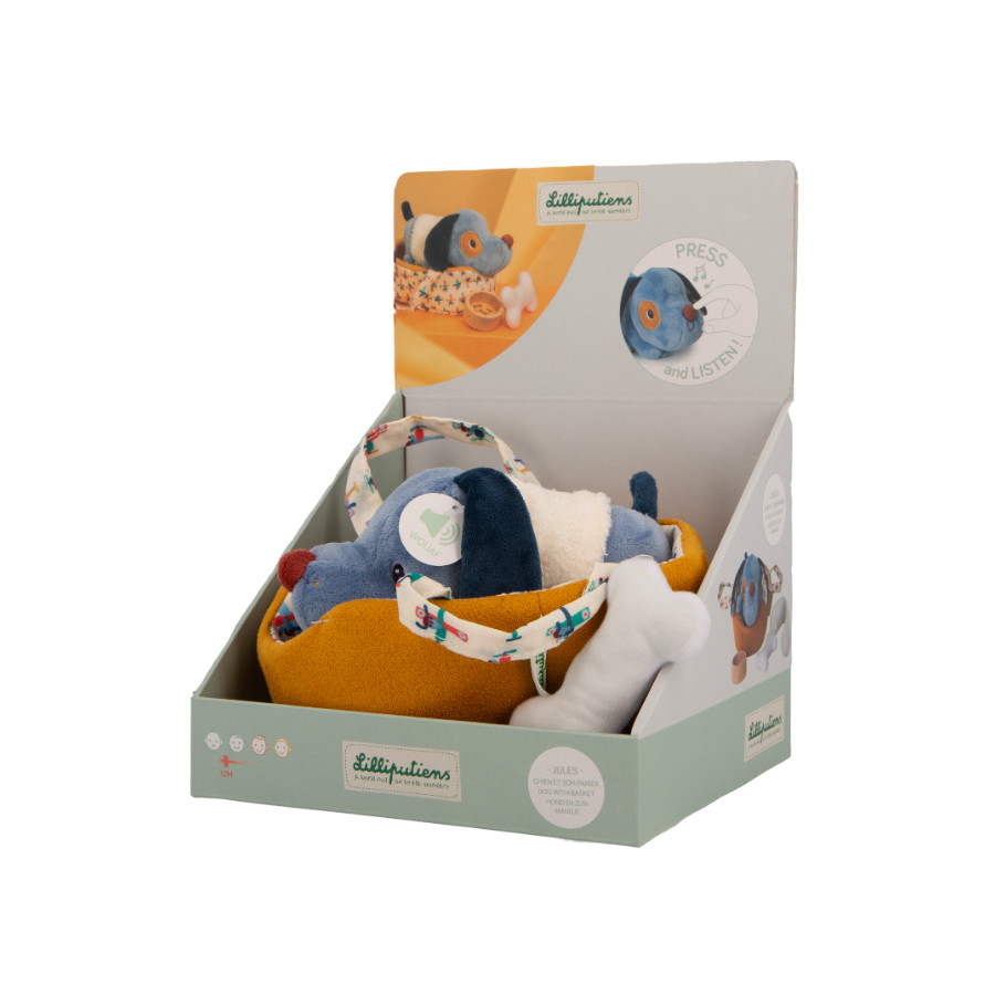 This cozy basket welcomes the charming puppy Jules. With his soft fur, he awaits to be pampered. By his side, a bowl and a chew bone, ready to be nibbled on. The child puts on his little jacket and gently strokes him. Jules barks happily when taken care of.