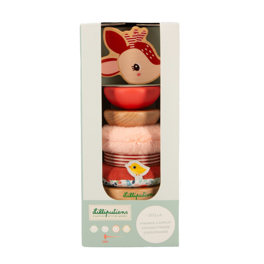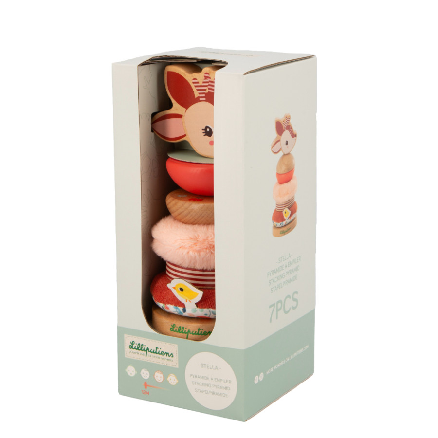Made of different materials, this original and cheerful stacking pyramid develops the fine motor skills of the little ones. Stack the parts on top of each other and give your creativity free rein. The different materials and colours stimulate the senses.