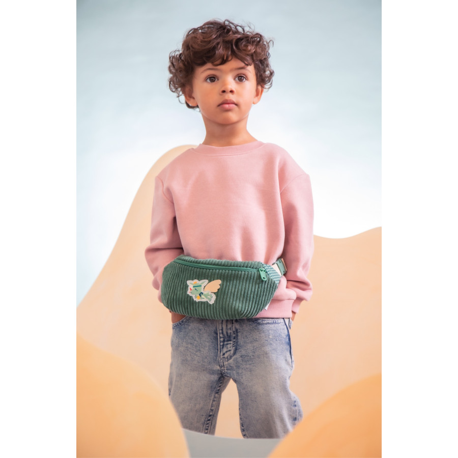Esta suave riñonera de pana completará los conjuntos de tus pequeñas. Joe, a la moda con sus alas doradas, protege y vigila los tesoros de esta bolsa.