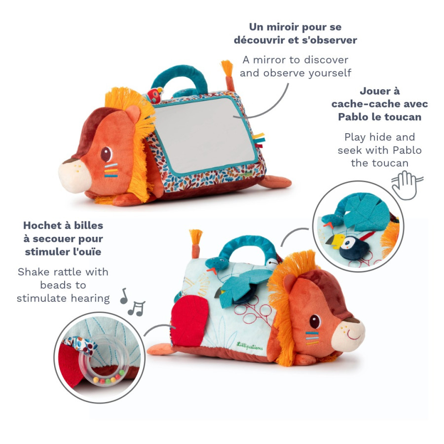 ¿El bebé está boca abajo? ¡Jack el león también! Para divertir y estimular a los más pequeños desde los 3 meses, nuestro león de peluche se presenta como un triángulo de actividades de tela con un gran espejo. En el programa: 6 actividades disponibles en ambos lados del peluche, para largas horas de juego y descubrimiento sensorial. ¿Empezamos apretando la nariz de Jack para escuchar un “pío”? Luego haz sonar la campanita en su espalda o levanta una gran hoja para descubrir un sonajero tucán: ¡hola Pablo! Después, un sonajero de bolitas muy interesante para observar y agitar.