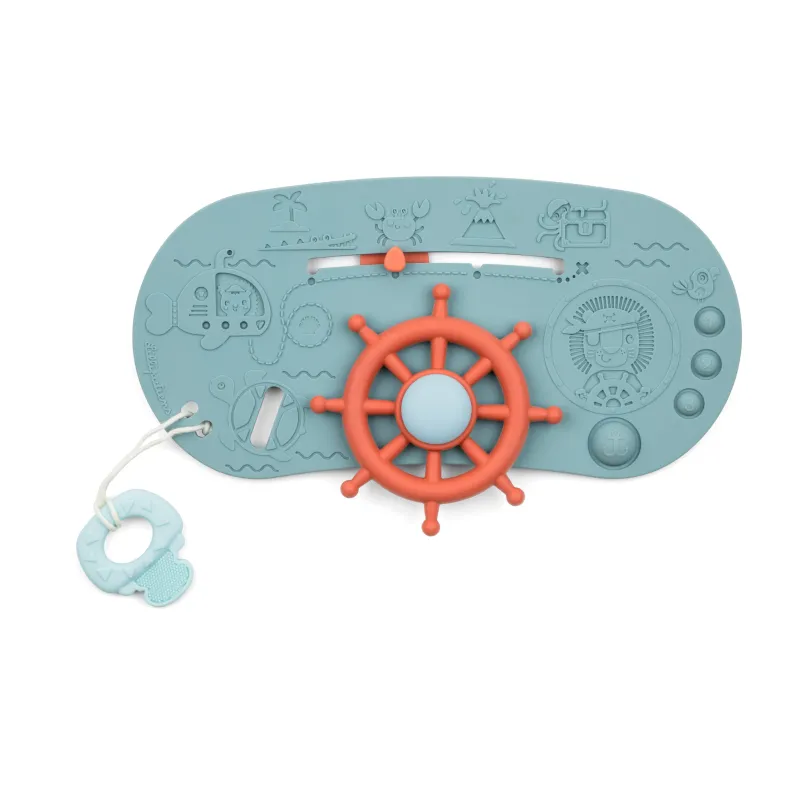 ¡Agarra el timón, marinero! ¡El baño se convierte en una aventura emocionante con este panel de barco pirata de silicona! Una vez fijado a la pared, la bañera o ducha se convierte en un recipiente listo para enfrentarse a las olas. ¿Y quién vigila la nave? Obviamente es Jack, nuestro león pirata reconocible por su parche en el ojo, acompañado por Pablo el tucán, siempre posado para observar el horizonte. Hoy, es el bebé quien lleva el timón y elige el camino hacia el tesoro. Se dibuja un camino en el panel: simplemente arrastra el cursor para decidir la siguiente parada. ¿Te diriges a la Isla de las Palmeras? ¿Un encuentro con el cangrejo travieso? ¿O se dirige al volcán aterrador? Y durante todo el viaje, un submarino, pilotado por un gato gracioso, acompaña el barco. Cada detalle del panel está diseñado para estimular la curiosidad y las habilidades motoras finas de los más pequeños. Para arrancar el barco, el bebé introduce la boquilla de silicona en su ranura: un accesorio perfecto para manitas pequeñas... ¡E incluso para aliviar la dentición gracias a sus alivios y cerdas! El timón, en el centro, te invita a girar para mantener el rumbo. A la derecha, los botones pop-it prometen hermosos descubrimientos sensoriales. ¡Cada gesto cuenta para llevar el barco al puerto! Hecho de silicona, el panel de baño se fija fácilmente con sus ventosas y puede limpiarse enjuagándolo. El juego de imaginación cobra vida: tu pequeño capitán inventa sus propias historias y aprende a coordinar sus gestos mientras se divierte. ¡Cada baño se convierte en un momento de complicidad y risas! ¡Todos a bordo!