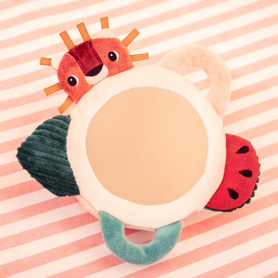¿Quién es este adorable pequeño en el espejo? ¡Jack el león invita al bebé a despertar sus sentidos con este espejo de actividad! Gracias al gran espejo central, el bebé puede observarse a sí mismo, sonreír, poner caras y explorar la noción de sí mismo. En la jungla de Jack, cada rincón esconde una sorpresa... En posición tumbada, el bebé podrá divertirse descubriendo distintos materiales mientras explora. ¿Qué tal si atrapas primero la hoja de terciopelo verde? Gracias al ruido del papel, cruje bajo los dedos de tu pequeño para despertar su curiosidad y estimular su oído. ¿Y la rodaja de sandía? Atraerá la atención del bebé con sus hermosos colores vivos y bordados diseñados para un toque fino. Luego, coge los dos mangos blandos, adecuados para manos pequeñas, para manipular y girar el espejo. Baby puede sostener el espejo solo para explorar sus reflejos, desarrollando su agarre. ¡Pero parece que el espejo está haciendo ruido! Un sonajero incorporado emite un sonido suave al agitar el juguete de desarrollo. En cuanto a la melena de Jack: las cintas de colores solo esperan una cosa... ¡Siendo atrapado por manitas curiosas! Agarrar, manipular, sacudir... Acciones sencillas que estimulan el tono y el fortalecimiento muscular a partir de los 6 meses. Muy práctico, hay un lazo discreto en la parte trasera para colgar el espejo por todas partes. Tu niño pequeño podrá divertirse con estos juegos sensoriales desde el carrito, la silla del coche o incluso su parque infantil. Con sus dimensiones de 17 x 17 x 6 cm, este espejo nómada es una gran idea para un parto.