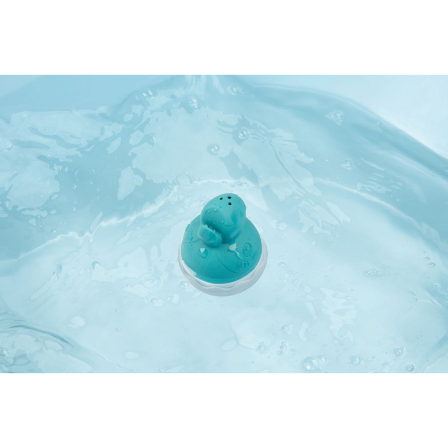 Pablo le toucan aspire de l’eau et s’en donne à cœur joie lorsqu’il s’agit d’en faire gicler partout autour de lui. Après s’être amusé avec l’eau, il rentre dans sa coquille pour se reposer à côté de bébé dans le bain.