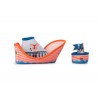 A l'abordage ! Sur son grand bateau pirate, Jack le lion a réunit tout son équipage pour parcourir les mers … Première étape du voyage : le bain des enfants ! Ce jouet de bain en deux parties se compose d'un grand bateau et de son nid-de-pie amovible. Le tout mesure 25 x 14 x 21 cm. Idéal pour le bain des petits dès 10 mois, il permet de développer leur motricité, leur imagination et leur réflexion en jouant dans l'eau ! Composé de néoprène, ce jouet d'eau est souple et pratique. Il flotte et sèche rapidement, pour un entretien facile une fois que l'aventure aquatique touche à sa fin. Le capitaine de ce bateau pirate pour le bain n'est autre que Jack le lion : il arbore un cache-œil tel un vrai loup de mer, et scrute l'horizon accompagné de Pablo le toucan. Sur le pont, il y a aussi Stella le faon, dans sa tenue de corsaire. Elle salue avec joie les autres aventuriers voguant à leurs côtés. Enfin, Ignace l'âne a lui aussi revêtu sa tenue de marin et mène à bien sa mission : du haut de son nid-de-pie, il utilise sa longue-vue pour repérer les îles encore inexplorées. Mais catastrophe ! Une grosse vague dans la baignoire fait chavirer le navire, et voilà qu'Ignace se trouve seul en mer ... Il ne lui reste plus qu'à ramer pour rejoindre l'équipage, et tout recommencer ! Vous l'aurez compris, ce bateau Lilliputiens rouge et bleu sera le centre des plus merveilleuses histoires de votre enfant à l'heure du bain ou de la douche. C'est aussi un jouet idéal lorsque l'on souhaite se rafraichir en jouant dans l'eau par une chaude journée. Alors matelots, montez à bord !