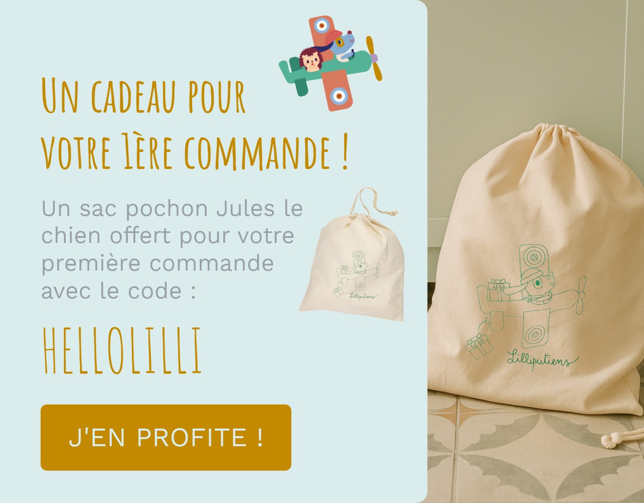 Pour votre première commande, recevez gratuitement un grand sac pochon Jules le chien avec le code HELLOLILLI.