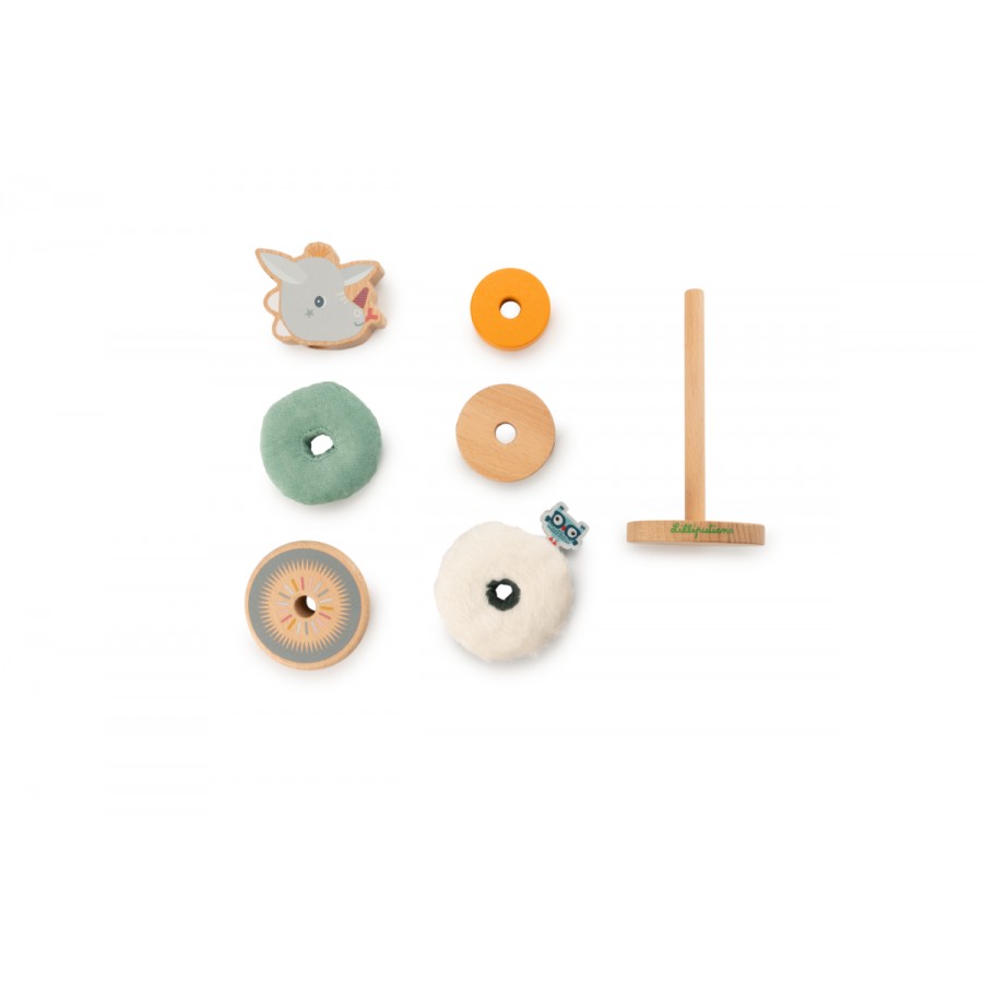 La pyramide multi-matières de bébé ! A l'effigie de Joe le dragon, cet empilable est le jouet d'éveil idéal pour stimuler la motricité et divertir bébé, dès 12 mois. Ici, pas de notion de taille à respecter, mais des matières et des motifs colorés à découvrir, pour éveiller les sens ! Avec son empilable sensoriel, votre tout petit manipule d'abord tous les anneaux pour découvrir leurs particularités : du bois naturel ou coloré, du touché velours ou coton, du tout doux, du tout lisse ... Oh ! Mais qu'elle est rigolote cette petite étiquette en forme de chouette ! C'est une amie chère à Joe le dragon, qui a aussi hâte d'apprendre en s'amusant. Au total, 6 éléments en bois et en tissu sont à empiler pour former la pyramide. Bien-sûr, c'est l'adorable bouille de Joe qu'il faudra placer en dernier, pour un résultat "Waouh" ! Au fur et à mesure que votre enfant progresse, il prendra plaisir à empiler les anneaux sur la tige en bois, et développera ainsi sa motricité fine et sa capacité de réflexion. Il va adorer tout retirer, tout empiler, puis tout recommencer ! Une fois assemblé, ce jouet à empiler mesure 18,8 cm de haut. Les anneaux en tissu qui composent ce jouet d'éveil peuvent être lavés en machine à 30°. Offrez dès maintenant sa première pyramide Lilliputiens à bébé !