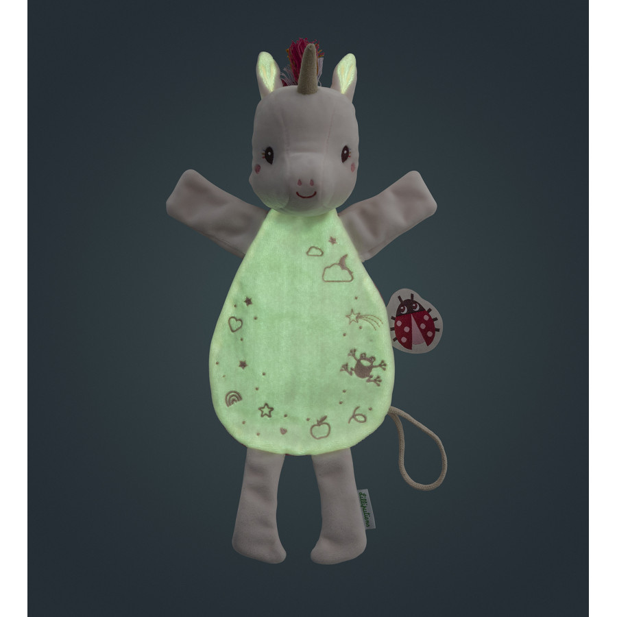Mon doudou, il fait tout ! Adapté dès la naissance, ce doudou Lena la licorne a tout pour plaire. Il est d’abord un compagnon de tous les instants pour bébé, d’une grande douceur et avec une frimousse souriante et amicale. Bébé emporte son doudou rose partout et reste confiant et apaisé tout au long de la journée. C’est aussi un doudou marionnette ! Glissez vos doigts dans les bras et derrière la tête de la licorne, et c’est parti pour le spectacle ! Saviez-vous que notre chère Lena est originaire de la forêt enchantée ? Faites-la sautiller, chanter des comptines, envoyez des baisers … De quoi divertir votre tout petit et partager de chouettes moments de complicité ! Mais ce n’est pas tout : c’est un doudou phosphorescent. Après une journée placée sous le signe du jeu et des câlins, place à une bonne nuit de sommeil paisible. Avec un doudou qui brille dans le noir, bébé est rassuré dans la pénombre et ne le perd jamais. Eteignez la lumière, et observez le ventre et les oreilles de ce doudou brodé : quelle belle lueur apaisante ! Le petit plus de ce doudou Lilliputiens, c’est la boucle attache-tétine intégrée, idéale pour ne jamais la perde de jour comme de nuit. Pour inscrire les informations du petit propriétaire de ce doudou licorne, une étiquette en forme de coccinelle est prévue. Cadeau de naissance malin et vraiment mignon, ce doudou mesure 18 x 35 cm et se compose de polyester et de coton. Il est lavable en machine à 30°. Avec Lena, place aux jeux, aux histoires, à l’exploration et aux bisous !