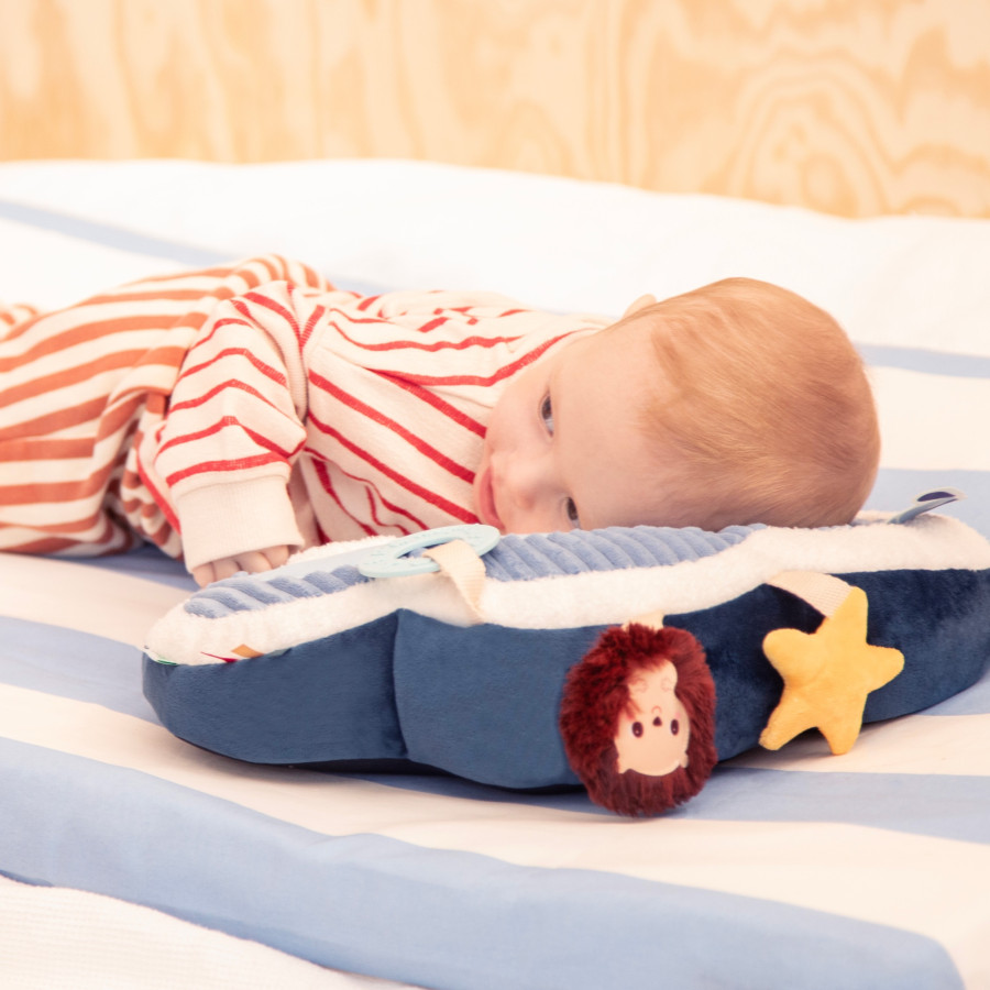 Direction les nuages avec Jules le chien ! Ce tendre coussin d'activités en forme de nuage accompagne bébé dans ses premières découvertes : les textures, les sons, les nuances de couleurs... C'est l'idéal pour développer sa motricité et éveiller tous ses sens. Jules le chien, aviateur hors pair, s’est envolé vers les nuages avec son fidèle compagnon Léon le hérisson. Ensemble, ils invitent bébé à embarquer pour un voyage tout en douceur… direction le ciel et ses merveilles ! Allongé sur le ventre, bébé s'installe confortablement et se lance dans l'exploration de ce coussin à l'aide de ses petites mains curieuses. En manipulant le coussin, bébé rencontre différentes matières qui stimulent son toucher. Dans sa découverte, il s’amuse avec le hochet aux billes colorées, il les regarde bouger et écoute le doux bruit qu’elles font. Jules le chien l'attend non loin de là pour lui faire un coucou ! Ensuite, bébé aperçoit Léon le hérisson, bien accroché au coussin, qui lui propose un hochet tout doux à secouer. Quelle joie de le faire tinter ! Puis, une étoile jaune attire son attention : en la froissant, bébé découvre un bruit de papier qui crépite entre ses doigts. Et pour soulager ses petites gencives, il attrape l’anneau de dentition à portée de main. Sa surface avec relief procure un massage doux qui apaise les tensions liées aux poussées dentaires, tout en offrant une expérience sensorielle agréable. Les étiquettes colorées, elles, invitent ses petits doigts à explorer encore plus. Chaque activité stimule ses sens et renforce sa tonicité musculaire ! Dans ses dimensions 7 x 36 x 23 cm, ce jouet d'éveil assure des moments de jeu remplis de douceur et de découvertes ! Prêts à embarquer avec Jules et Léon ?