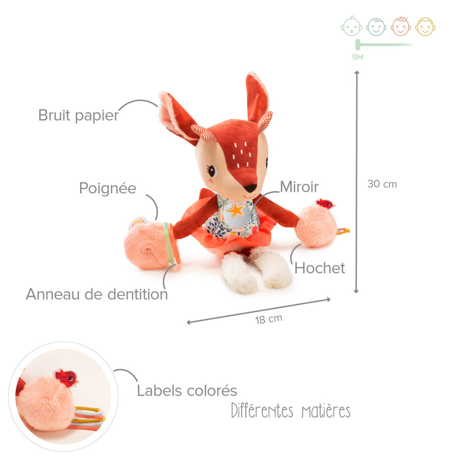 C'est parti pour le spectacle ! Avec sa peluche d'activités de 30 cm, bébé découvre toutes les surprises que Stella a à offrir, dès l'âge de 9 mois. Au total, ce sont 5 activités d'éveil qui sont à sa disposition pour qu'il découvre à son rythme. D'abord, du papier bruissant dans les oreilles : ça crépite sous les doigts ! Ensuite, un miroir rond sur le ventre, pour s'observer sous tous les angles. On secoue l'un des pompons, et on découvre un hochet ! A son poignet, voilà deux jolis bracelets qui sont en fait des anneaux à mordiller. Pour finir, bébé découvre des rubans et des étiquettes colorés qui sont des extensions de plus à parcourir. La diversité des matières, les éléments en relief ainsi que les broderies font de cette peluche multi activités un jouet d'éveil doux et ludique. Avec Stella, votre petit trésor découvre par le toucher, apprend à être curieux et découvre des sons et motifs variés. Le petit plus de cette peluche Lilliputiens : la poignée qui se trouve dans l'un des pompons de Stella. Aussi douce à câliner que riche d'activités, elle sera l'amie inséparable de votre bébé et un cadeau de naissance de choix pour célébrer son arrivée. Vous pouvez laver la peluche faon en machine à 30°. Allez Stella, fait le show !
