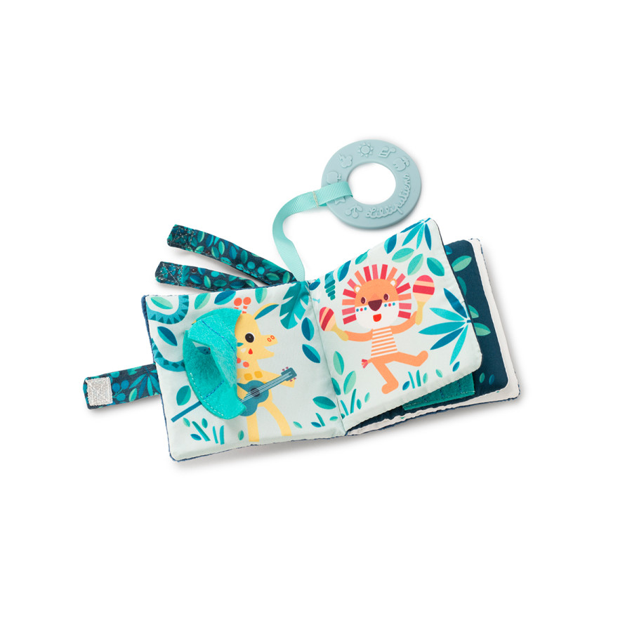 Le tout premier imagier de bébé ! En compagnie de Marius le rhino, votre tout-petit découvre ses premières histoires, dès l'âge de 6 mois. Ce petit livre pour bébé au format 10 x 10 cm a été spécialement pensé pour être manipulé par les petites mains potelées. Au fil des pages de ce livre en tissu, Marius vous emmène dans la jungle pour faire connaissance avec ses petits copains. Tiens, ne serait-ce pas Jack le lion qui danse ? Et qui se cache sous cette feuille en feutrine ? Oh, bonjour Zia la girafe ! En plus des illustrations poétiques à observer, des petites surprises sont à découvrir du bout des doigts. Votre enfant développe alors son acuité visuelle et sa motricité fine, tout en profitant de l'histoire : un vrai bain de langage ! Les matières variées que propose cet imagier permettent de stimuler le sens du toucher : regardez comme la bouille de Marius est douce ! Et pour attiser la curiosité de bébé et favoriser son éveil aux sons, la couverture du livre contient du papier bruissant à faire crépiter. Le petit plus de cet imagier Lilliputiens, c'est l'anneau de dentition bleu qui lui est accroché. C'est idéal pour soulager les gencives douloureuses quand les dents commencent à faire leur apparition ! Vous pouvez suspendre le premier imagier de bébé à l'aide du ruban avec attache scratch, pour toujours l'avoir à portée de main. Partagez dès maintenant votre première histoire en famille ! Vous pouvez laver ce livre d'images en tissu en machine à 30°.