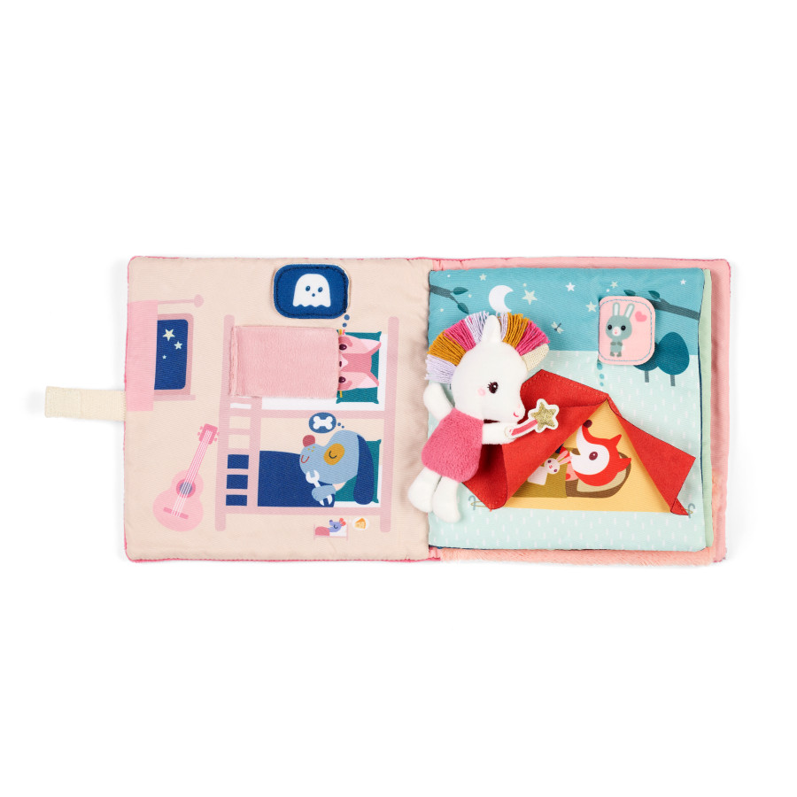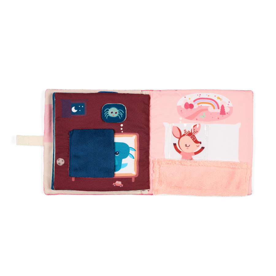 Sogni d'oro con Lena! Adatto ai bambini a partire dai 12 mesi, questo libro in tessuto racconta la storia magica di Lena, l'unicorno, che parte in una caccia agli incubi per trasformarli in sogni d'oro. Ideale per le prime storie, questo libro di apprendimento precoce dai colori delicati crea un'atmosfera rassicurante per il bambino e lenisce le sue piccole paure. Con Lena, la notte può essere piena di magia! Al calar della notte, Jules il cane, Joe il drago e i loro amici cadono in un sonno profondo, ma i brutti sogni si nascondono. Per fortuna, Lena veglia sui suoi amici! Gira per ogni stanza per cacciare questi piccoli mostri con i suoi poteri magici. Per rendere l'avventura ancora più vivace, un adorabile peluche unicorno accompagna il libro: prendilo e vai con Lena a incontrare gli amici addormentati. Insieme, trasformate gli incubi in bellissime storie incantate! Questo libro interattivo nasconde anche le sorprese: alcuni elementi del tessuto si sollevano per stimolare la curiosità e i sensi di tuo figlio. Incoraggia tuo figlio a nominare oggetti familiari in ogni stanza per costruire il vocabolario e divertirsi. Con questo libro di attività in tessuto, il bambino sviluppa non solo la vista e le capacità motorie, ma anche il pensiero e l'immaginazione. Facile da portare ovunque, il libro può essere esplorato indipendentemente o condiviso con te per momenti complici. Nel suo formato quadrato di 16x16 cm e accompagnato dal suo carino peluche, è tanto giocoso quanto facile da maneggiare per i più piccoli. Per una manutenzione facile, puoi lavare il set in lavatrice a 30°.