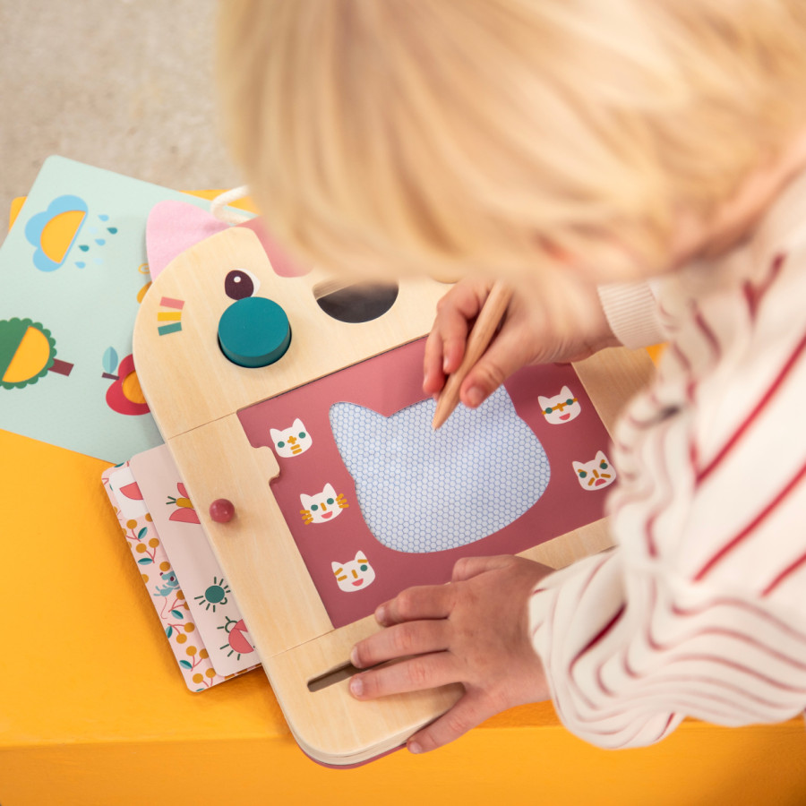 Una lavagna magica, unica e originale! Con la lavagna in legno Jeanne the Cat, i bambini possono disegnare e divertirsi con tanti piccoli giochi, a partire dai 18 mesi. Corredato da 6 carte fronte-retro, per un totale di 12 giochi disponibili, terrà i più piccoli impegnati per molto tempo! La matita di legno attaccata con un cordino al lato destro della lavagna non andrà mai persa. Tuttavia, se necessario, è possibile staccarlo. Con lui, c'è spazio per l'espressione artistica sul viso della bella Jeanne! Ma non è tutto, questa lavagna magica Lilliputiens propone 3 forme (cerchio blu, ovale giallo, semicerchio rosa) che saranno molto utili per creare disegni originali o per svolgere le attività proposte. Sul lato sinistro della lavagna, tutte le schede delle attività scorrono e sono facili da riporre. Con essi, il tuo bambino forma facce buffe, impara a tracciare linee o percorsi... Ci sono giochi per tutti i gusti, più o meno complessi da realizzare, per una sfida sempre più grande! E per cancellare tutto basta far scorrere il pesciolino: così carino! Poiché amiamo le sorprese, tu e il tuo bambino scoprirete colori diversi sulla superficie da disegnare. Questa lavagna magica è ideale per intrattenere i bambini durante i viaggi: tutti gli accessori sono facili da riporre ed è dotata di una pratica maniglia per trasportarla ovunque. Inoltre, misura 32,7 cm di altezza, offrendo una superficie pratica e artistica senza compromessi. E che belle orecchie rosa! Grazie alla lavagna di legno, il tuo piccolo svilupperà le sue capacità motorie fini, l'immaginazione e il pensiero. Da questa parte dei capolavori!