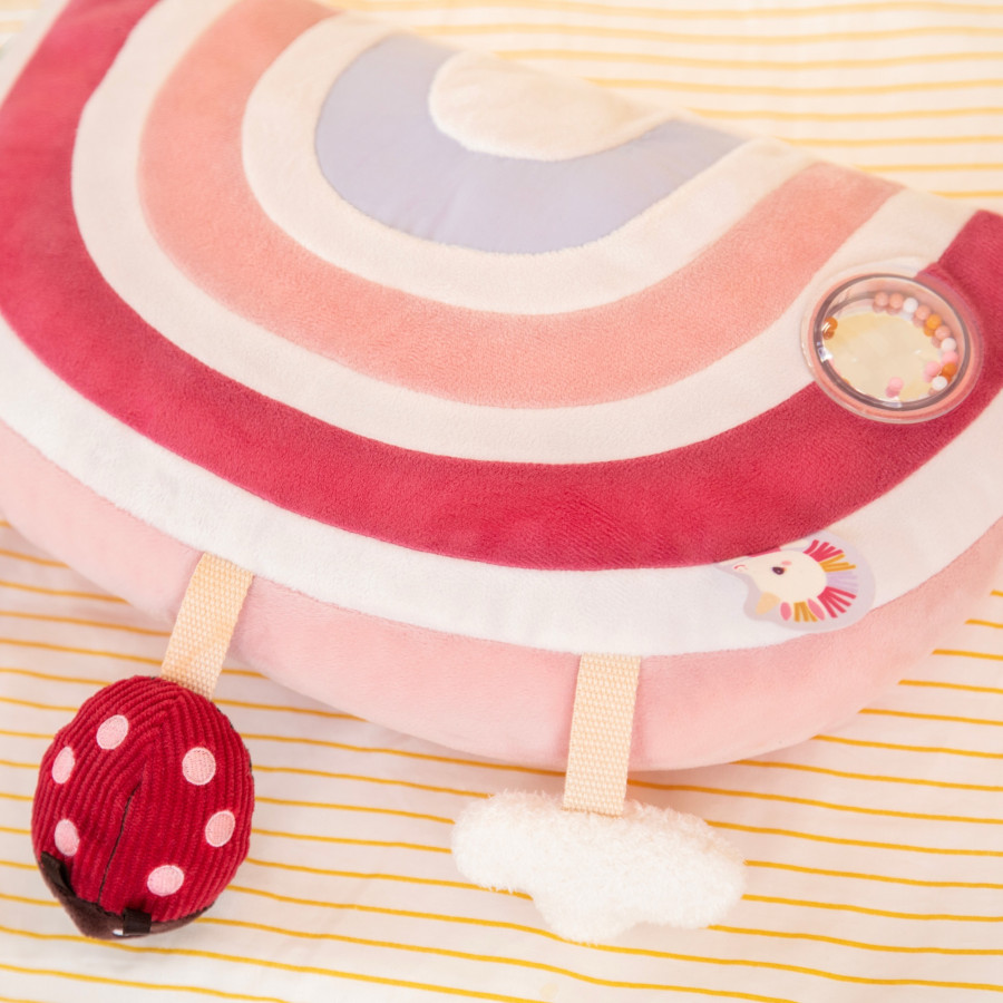 Andiamo nella foresta magica di Lena! Questo tenero cuscino d'attività a forma di arcobaleno accompagna il bambino nelle sue prime scoperte: texture varie, suoni divertenti, sfumature di colore... È il modo perfetto per stimolare le sue abilità motorie e risvegliare tutti i suoi sensi. Lena l'unicorno, guardiana della foresta incantata, ha attraversato l'arcobaleno per raggiungere il suo mondo fiaba. Invita il bambino a intraprendere un viaggio pieno di dolcezza e sorprese! Sdraiato a pancia in giù, il bambino si siede comodamente e come se stesse esplorando quel cuscino con le sue curiose maninole. Scopre diversi materiali che risvegliano il suo tocco. Mentre maneggia il cuscino, gioca con il sonaglio con biglie colorate: osserva le biglie danzare e ascolta il loro suono morbido. Ma chi è? È Lena, pronta ad accogliere il bambino e a suscitare la sua curiosità! Più avanti, la sua amica coccinella aspetta il bambino con un leggero tintinnio per scuotere e sentire il suo delicato tintinnio. Poi, una bella nuvola attira la sua attenzione: accartocciandola, il bambino scopre il suono strano della carta che scricchiolava sotto le sue dita. E per calmare le gengive, prende l'anello di dentizione rialzato, perfetto per massaggiare e alleviare i denti piccoli che stanno crescendo. Etichette colorate completano l'avventura invitando il bambino a esplorare ancora di più con le dita. Ogni attività stimola i suoi sensi, la sua curiosità e rafforza il tono muscolare! Con le sue dimensioni di 7 x 36 x 23 cm, questo giocattolo di sviluppo trasforma questo momento sullo stomaco in un magico gioco pieno di scoperte. Pronta a unirti a Lena nella sua foresta incantata?