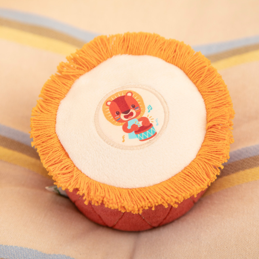 Baby si sta appassionando alla musica! Con questo tintinnio di tamburo, il tuo piccolo risveglia delicatamente i suoi sensi dall'età di 3 mesi. Come il nostro amico Jack il leone, un vero musicista nel profondo, tuo figlio si divertirà a imitare gli adulti fingendo di suonare il tamburo! Per risvegliare il suo udito, questo sonaglio emette allegri suoni di "Toot" e carta accartocciata e offre anche diverse texture e piccole frange ispirate alla criniera di Jack per favorire l'esplorazione tattile. Semplicemente agitando il sonaglio di peluche o replicando i gesti dei più grandi, tuo figlio godrà un'esperienza sensoriale completa! Oltre a stimolare i sensi dei più piccoli, questo dolce sonaglio incoraggia l'immaginazione e l'imitazione attiva. Abbastanza da intrattenerli per lunghe ore di gioco! Grazie alla sua dimensione pratica di 10 x 10 x 7,5 cm, questo sonaglio di peluche è perfettamente adatto ai neonati. Se stai cercando un giocattolo originale per lo sviluppo, sei nel posto giusto! Lavabile in superficie, questo sonaglio è fatto di poliestere. Dagli subito il suo primissimo strumento musicale lilliputiano!