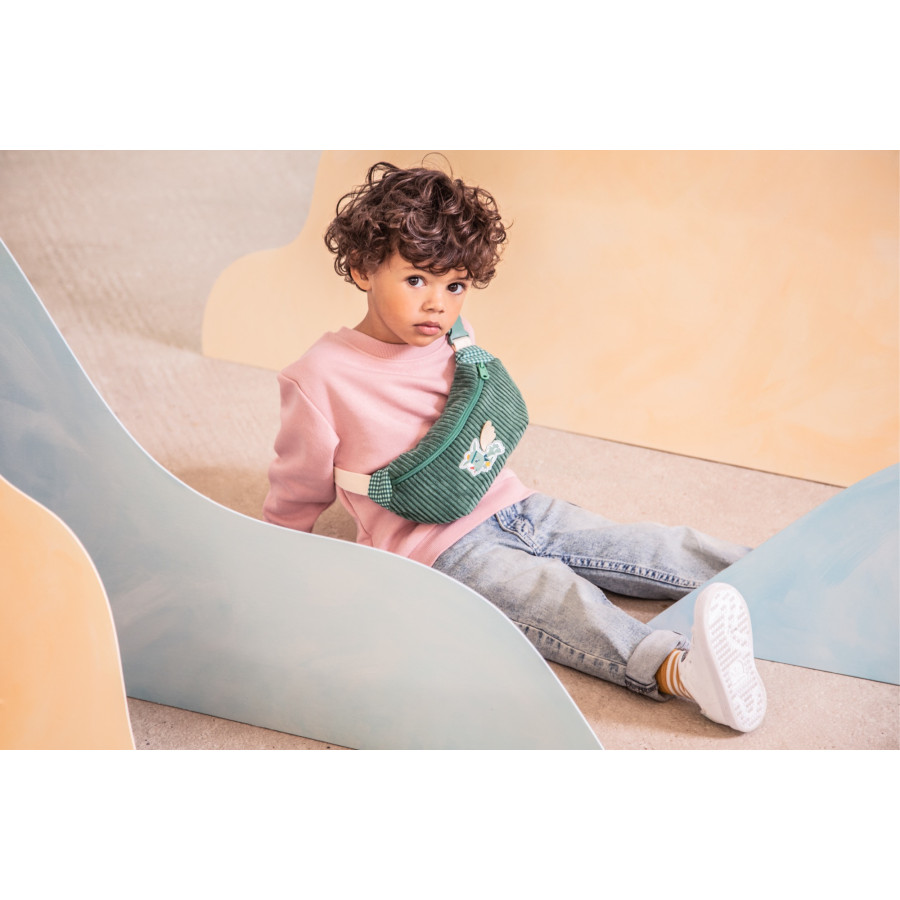 Questo morbido marsupio in velluto a coste completerà gli outfit dei vostri piccoli. Joe, alla moda con le sue ali dorate, protegge e veglia sui tesori contenuti in questa borsa.