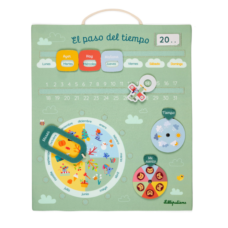 De eerste kinderkalender! Elke dag is een kans om te leren hoe je de tijd kunt vinden met onze stoffen kalender, geschikt voor kinderen vanaf 3 jaar. Het is de ideale ondersteuning om het begrip tijd beter te begrijpen en hun emoties te herkennen. Dankzij de draaibare wijzerplaten en de krasbestendige elementen kunt u op de agenda het volgende aangeven: de datum van vandaag, uw ideeën van gisteren en morgen, de maand en het seizoen waarop het betrekking heeft, het huidige jaar, het weer en uw humeur van de dag. Om te leren in goed gezelschap, kun je Jules, onze vliegeniershond, in zijn vliegtuig vinden, zijn vriend Léon de egel, maar ook grappige kleine muisjes en een heleboel schattige illustraties op dit stoffen activiteitenpaneel. Door de mooie kleuren en speelse uitstraling past deze kalender perfect in de inrichting van kinderkamers. Met dit educatieve spel van Lilliputiens kunt u samen met uw kind uw eigen dagelijkse rituelen opzetten: noteer de datum, kies samen de outfit die het beste past bij het weer van vandaag... Praktisch en licht, kan het gemakkelijk aan de muur worden gehangen met behulp van het koord: ideaal bijvoorbeeld bij het raam om de weersvoorspellingen te bekijken. Met zijn formaat van 39,5 x 46 cm is dit stoffen dagboek een leuke manier om te leren hoe de wereld om ons heen werkt en om het dagelijkse leven van uw kleine nieuwsgierige kind om te toveren tot een waar avontuur! Kalender "Over Time" van polyester en katoen, Spaanse versie.
