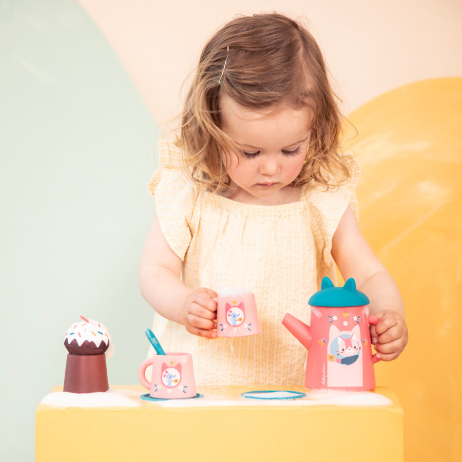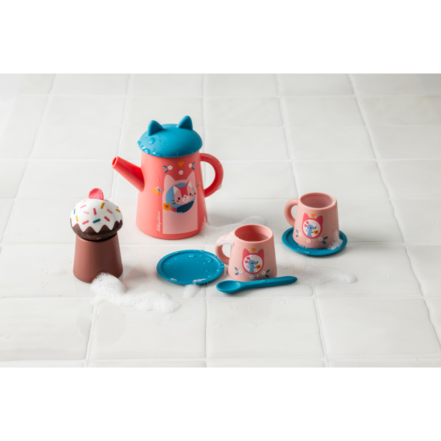 Klaar voor een spetterende snack? Hier is een origineel badspeeltje: een theeservies, ontworpen voor kinderen vanaf 18 maanden. Deze theepot en de bijbehorende accessoires zijn ideaal om in en uit het water te spelen en doen denken aan een speelkeukentje. Ze zijn perfect om de fantasie van volwassenen te imiteren! Deze theeset bestaat uit 9 delen en bestaat uit: een theepot met de afbeelding van kat Jeanne en een siliconen deksel met kleine kattenoren, twee kopjes met muisjes erop, twee schoteltjes, een klein lepeltje en een tweedelige muffinvorm voor eenvoudig onderhoud. Wij gieten, wij morsen, wij schenken... Welke andere plek is daarvoor beter geschikt dan de badkamer? Misschien weet u het al, maar onze Jeanne houdt ervan om thee te drinken met haar vriendinnen. Het is tijd voor haar om te ontspannen, een beetje zoals badtijd! Dit fantasiespeelgoed is geschikt voor zowel water- als keukenplezier. Met zijn gastronomische accessoires nodigt hij uit tot gezelligheid op elk moment van de dag! Een hapje eten met oma? Een grote plons in het bad? Een gietbeurt om af te koelen op een warme dag? Het zijn de kinderen die beslissen! Ontworpen om gemakkelijk te drogen: spoel de set eenvoudigweg af met schoon water en laat alle onderdelen drogen tot het volgende gebruik. “Het is theetijd!” »