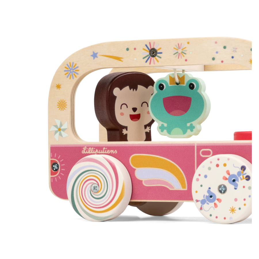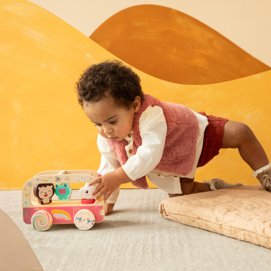 Allemaal aan boord van de extravagante bus van Lena de Eenhoorn! Het is geschikt voor kinderen vanaf 10 maanden en bestaat uit 3 figuren, maar dat is niet alles! Bewonder de illustraties die deze houten babybus sieren: sterren, glitter, een explosie van kleuren... We voelen de magie al! Ideaal om uw kind te helpen beweging te ontdekken en zijn/haar fantasie te stimuleren. Dit Lilliputiens-activiteitenspeelgoed zit boordevol leuke functies. Wanneer uw kleintje de bus laat rollen, worden er leuke mechanismen geactiveerd: aan de binnenkant draait Léon de egel en duwt vervolgens de hangende kikker voort, die vervolgens alle kanten op zwaait! Heb je opgemerkt dat de gezichtsuitdrukking van onze egelpassagier verandert? Bovendien zorgen de draaiende wielen voor grappige visuele effecten. Dit meegroeiende houten speelgoed wordt geleverd met een afneembaar touwtje, dat u aan het voertuig kunt bevestigen naarmate uw kind groeit. Dit kleine houten busje is gemakkelijk te hanteren voor de allerkleinsten: door aan het touwtje te trekken of van bovenaf. Ze blijven er versteld van staan! Bij de eindhalte kunt u het kleine knuffeltje Lena de eenhoorn uit de bus halen, zodat u met uw kleintje allerlei avonturen kunt beleven. Onze glamoureuze eenhoorn vindt het leuk om met haar vriendjes een ritje te maken, maar bestrijdt ook graag nachtmerries. In haar magische bus laat ze geen kans onbenut om het pad van haar dromen te bewandelen, om nuttig te zijn voor anderen en haar magie te delen. Van ontdekken hoe je moet lopen tot het verzinnen van je eerste verhaaltjes, dit houten voertuig heeft het allemaal! Dit loopspeeltje heeft de afmetingen 20 x 10,8 x 13,5 cm en is gemaakt van FSC-gecertificeerd hout en polyester. Je kunt het eenhoornknuffeldier wassen in de wasmachine op 30°C, en alleen de rest van het speeltje aan de buitenkant. Dus, ga op pad en activeer de magie!