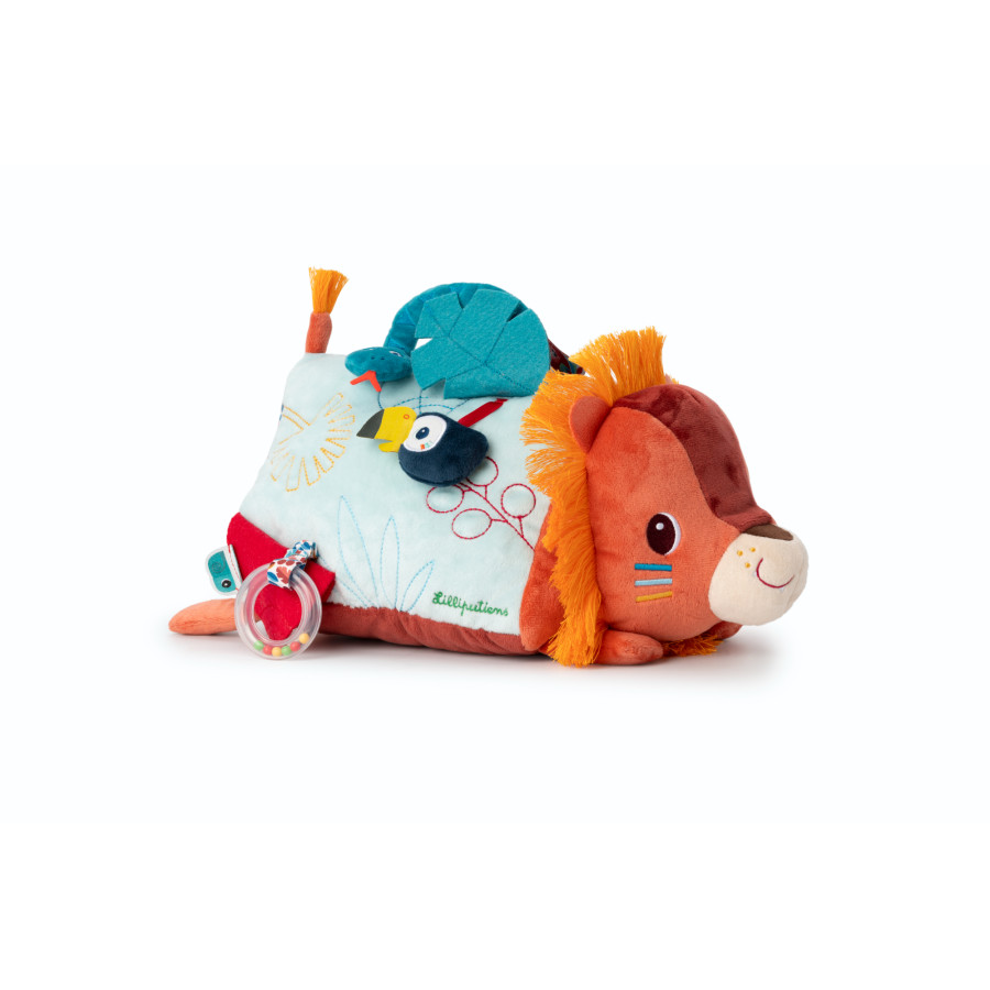 Ligt je baby op zijn buik? Jack de leeuw ook! Om de allerkleinsten vanaf 3 maanden te vermaken en te stimuleren, komt onze knuffelige leeuw in de vorm van een stoffen activiteiten‑driehoek met een grote spiegel. Op het programma: 6 activiteiten aan beide kanten van de knuffel, voor lange uren vol spel en ontdekking. Begin maar eens met het knijpen in Jacks neus om een “piep” te horen. Laat daarna het belletje op zijn rug rinkelen of til een groot blad op om een toekan‑rammelaar te ontdekken – hallo Pablo! Vervolgens is er een kralenrammelaar die fascinerend is om te bekijken en te schudden.