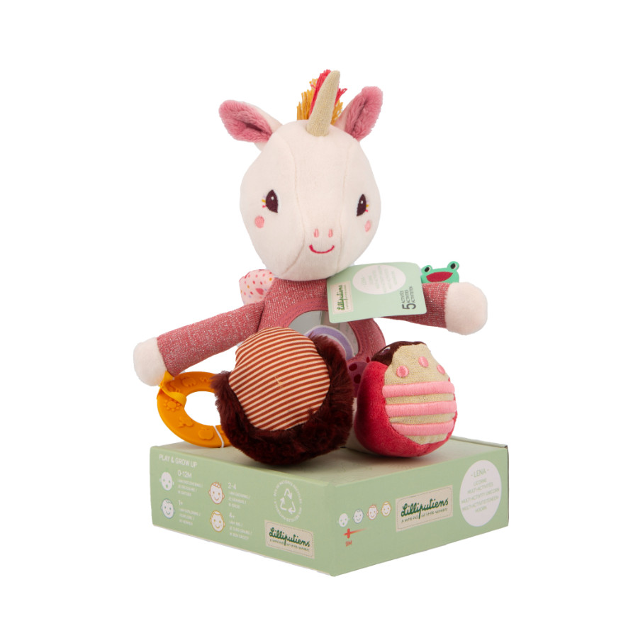 Lena de eenhoorn biedt tal van activiteiten om de zintuigen van de kleintjes te prikkelen. Voorzien van een zachte bijtring, een spiegel bedekt met een regenboog en kleurrijke manen, zit deze magische metgezel vol verrassingen.