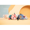 Ben je aan het rollen, Jules? Met zijn Jules de hond geluidsrol ontdekt de baby 4 geluiden en verschillende materialen, vanaf de leeftijd van 6 maanden. In het gezelschap van onze pilotenhond wordt je kleintje zachtjes wakker en ontwikkelt zelfs zijn motoriek en denken! Dit activiteitenspeelgoed wordt geleverd in de vorm van 4 pluche cilinders, waarvan er 1 het goede gezicht van onze schattige hond heeft. Elk klein rolletje biedt een ander geluid, maar ook andere materialen en aantrekkelijke patronen. Je kleintje kan zijn vroege leerspeeltje eindeloos in en uit elkaar halen dankzij de krassen op elke cilinder. Bekijk de unieke kenmerken van de spoelen afzonderlijk, of zet Jules in elkaar om hem te laten kronkelen op muziek! De eerste rol zendt, net als de hond, een zacht rinkelend belletje uit. Mollig en erg zacht, het heeft grote oren die zeer aangenaam zijn om rond te lopen en gemakkelijk te vangen. De tweede rol nodigt je kind uit om de lucht met zijn vliegtuigpatronen te verkennen. Met Jules' armen aan de zijkanten kun je hem vastpakken om erop te drukken en een grappig geritsel horen. De derde haspel is een balrammelaar die de baby net zo graag zal schudden als observeren. Ten slotte klinkt de vierde spoel als een tuimeling wanneer deze wordt geschud. Met zijn mooie rode groeven is het een lust voor het oog en de kleine handjes! De contrasterende kleuren zijn vooral geschikt voor het gezichtsvermogen van baby's op deze leeftijd, en het staartje van Jules is echt leuk. Dit Lilliputter activiteitenspeelgoed is 4 speeltjes in één! In zijn formaat van 34 x 10 x 10 cm is dit klankopwekkende speelgoed een ideaal stimulerend cadeau om te geven ter gelegenheid van een geboorte. Oppervlak wasbaar.