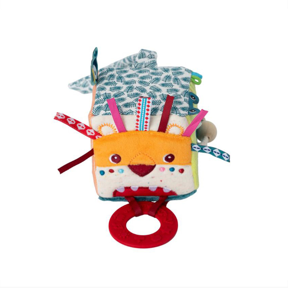 Ontdek de activiteiten en verhaaltjes van deze zachte kubus rond het junglethema. De bijtring biedt verlichting bij doorkomende tandjes.Stimuleert de zintuigen, fijne motoriek en het vastpakken.