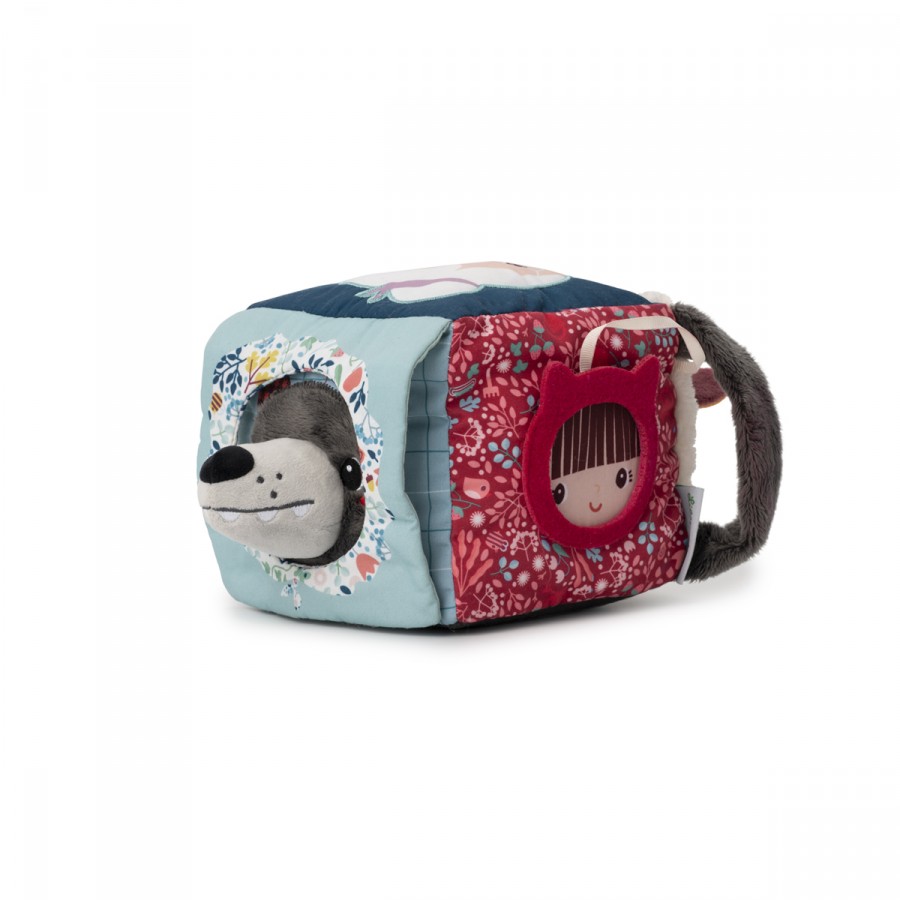 Een kleurrijke kubus met verschillende geluidjes, materies en op elke zijde een verrassing. Flapjes en vormpjes verbergen Grootmoeder, de wolf, Roodkapje en een biggetje. En wat zie je in de spiegel ? Een schaapje ?