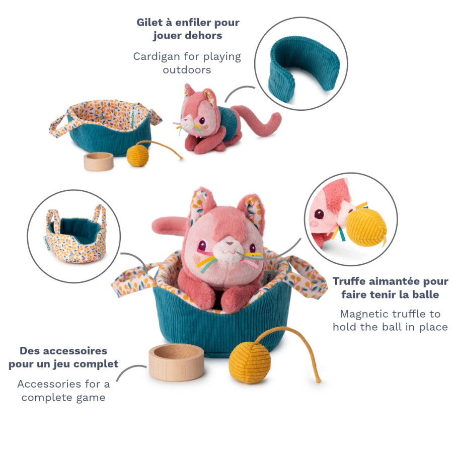 Wat een schattig klein katje in zijn mandje! Jeanne, de knuffelkat, en haar accessoires zullen jong en oud vanaf 12 maanden bekoren. Om plezier te hebben en voor zijn eerste katje te zorgen, heeft uw kind alles wat het nodig heeft: een omkeerbaar mandje met een geribbelde kant en een kant met motiefjes, een bolletje gele wol, een houten voerbakje met een visjesprint op de bodem en een afneembaar vestje. Dat zijn 4 accessoires om haar knuffelkat te voeren, mee te spelen of rustig te laten slapen in haar mandje. Met de handvatten kan Jeanne en haar spulletjes overal mee naartoe worden genomen! Extraatje: een ingebouwde magneet zodat Jeanne haar bal op haar neus kan laten balanceren! Een echt zachte, originele en schattige knuffel! De gele kersenmotieven op het mandje passen bij die op de oren van Jeanne. Ze doen denken aan de vruchten die groeien in de tuin waar ze zo graag speelt! Haar kleine snorharen zijn een extraatje om te ontdekken terwijl je deze knuffel van Lilliputiens knuffelt. Jeanne trekt graag haar vestje aan om buiten te spelen, met haar favoriete bal te rollen en een dutje te doen na een lekkere maaltijd. Met haar ontwikkelt uw kleintje zijn verbeelding en empathisch vermogen. Jeanne is zacht en vriendelijk en zal een trouwe vriendin voor uw kind zijn. Het roze knuffeltje en de accessoires zijn machinewasbaar op 30°, met uitzondering van de houten onderdelen. Luister naar dat zachte spinnen...