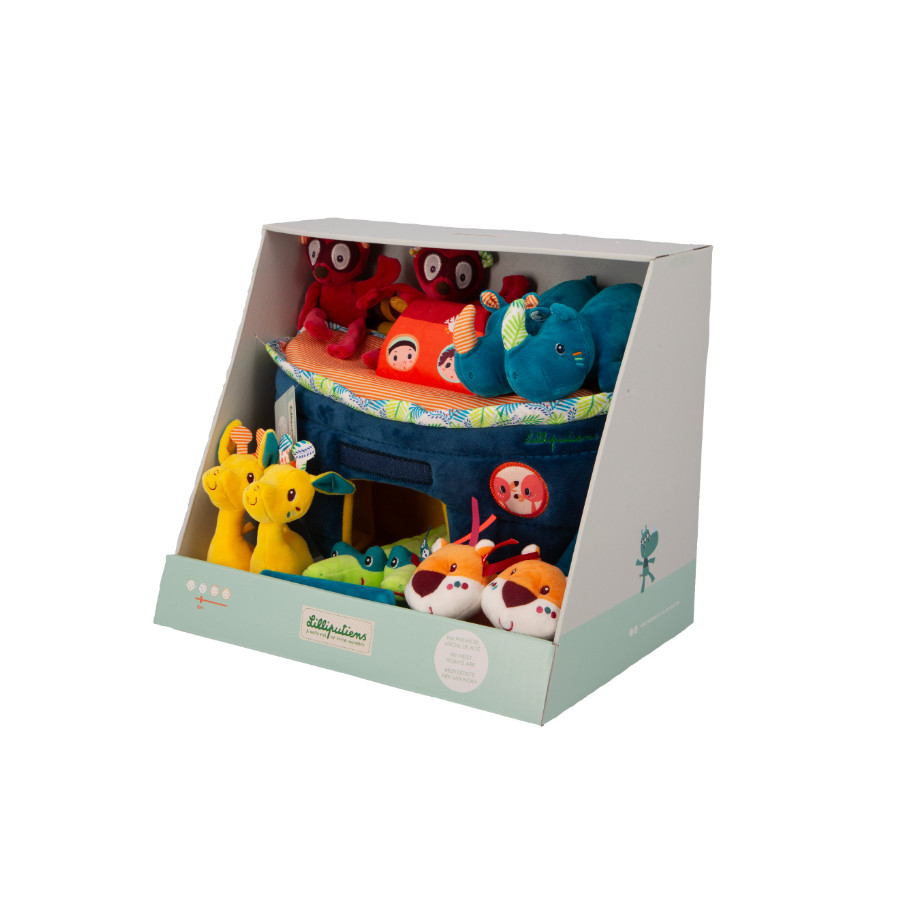 Allemaal aan boord! In de eerste ark van Noach voor de allerkleinsten komen de dieren per paar. In totaal zijn er 10 kleine knuffeldieren inbegrepen bij de stoffen boot. Perfect voor de kleintjes vanaf 18 maanden om verhalen te bedenken. Samen ga je op avontuur met: 2 maki’s, 2 giraffen, 2 krokodillen, 2 neushoorns en 2 leeuwen. Elk dier heeft een eigen kenmerk om ze van elkaar te onderscheiden – kun jij ze ontdekken? De hele menagerie past via de opening in de boot.