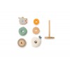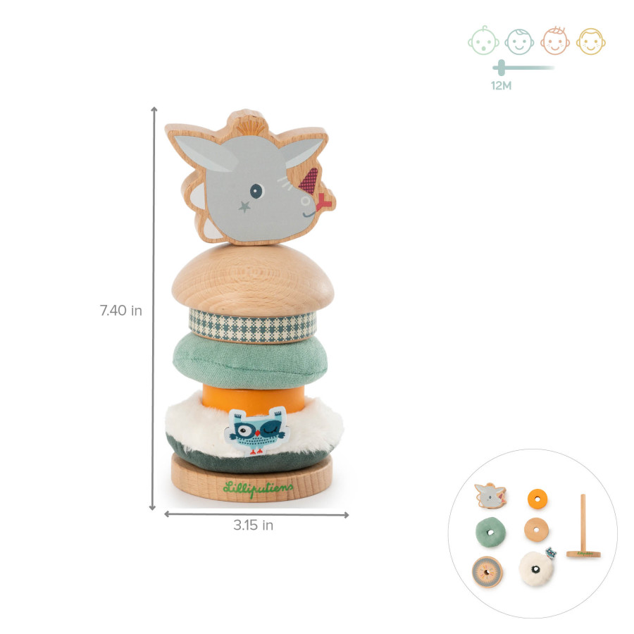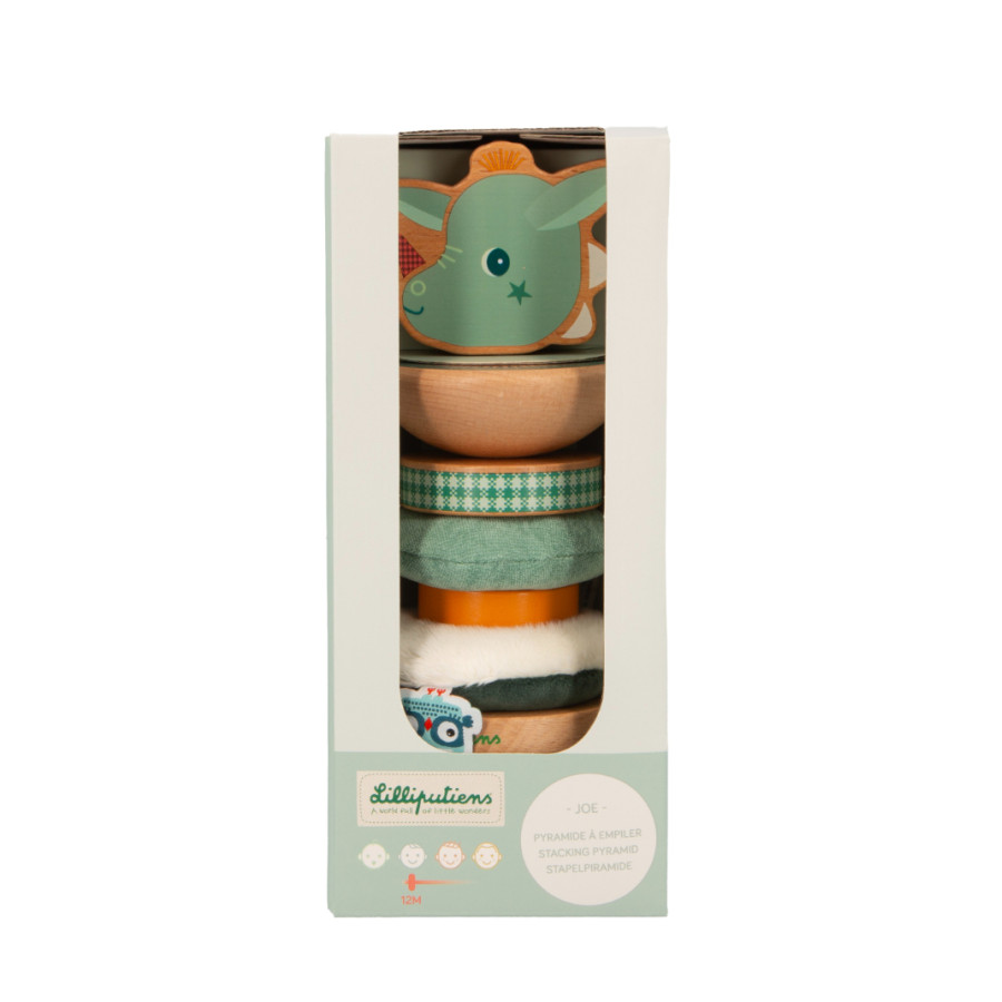Deze originele en vrolijke stapelpiramide, vervaardigd uit verschillende materialen, ontwikkelt de fijne motoriek van de kleintjes. Stapel de onderdelen op elkaar en laat je creativiteit de vrije loop. De verschillende materialen en kleuren stimuleren de zintuigen.
