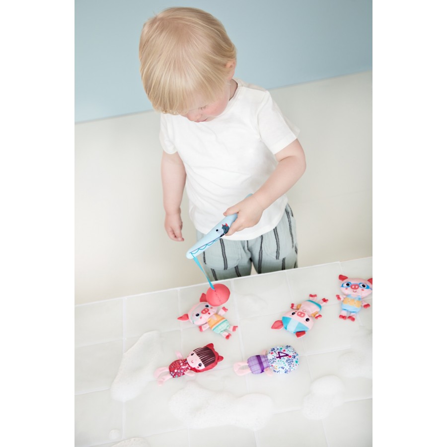 Roodkapje, grootmoeder en de 3 biggetjes zwemmen in de vijver. Maar grapjas Louis de wolf ligt op de loer en vist ze eéén voor één uit de vijver. Een origineel en grappig visspel voor uren waterpret !