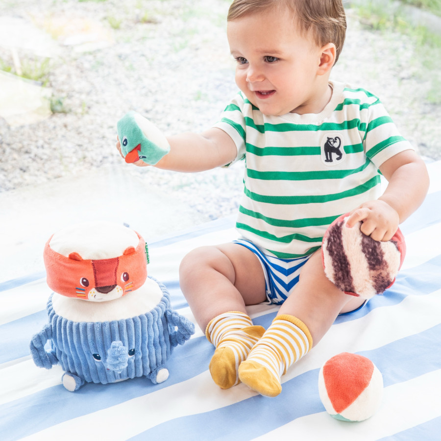 Let op de landing! Baby liet de piramide schudden! Dit stapelbare stoffen geluidspeeltje is ideaal om de zintuigen van de baby te stimuleren terwijl ze plezier hebben, vanaf 12 maanden. Albert de olifant heeft een heel speciale missie: trots zijn junglevrienden dragen om de grappigste piramide ooit te vormen! Helemaal onderaan staat Albert rechtop met zijn grote zachte oren... dan komt Jack de leeuw aan land, gevolgd door Elvis de maki, altijd klaar om een show neer te zetten. En helemaal bovenaan kijkt het kleine parkiet naar het tafereel! Baby stapelt deze vier stoffen dieren één voor één om een zintuiglijke toren vol verrassingen te bouwen. Door de knuffeldieren te hanteren, kan hij verschillende materialen verkennen: een traktatie voor kleine handjes! Dit vroege leerspel stelt je kind in staat om op speelse wijze zijn of haar aanraking en hand-oogcoördinatie te ontwikkelen. Maar dat is nog niet alles: elk personage verbergt een grappig geluid om te ontdekken terwijl je bouwt! Het is perfect om je kleintje wakker te maken voor geluiden. En deze piramide is geen gemakkelijke taak... tussen Jack die al droomt van feesten, Elvis die alle kanten op beweegt en de parkiet die kletst, moet je de juiste balans vinden zodat al deze kleine mensen op hun plek blijven! Baby zal het leuk vinden om een heleboel verhalen te verzinnen om met deze vriendengroep te spelen, waardoor zijn verbeelding prikkelt. En wanneer de piramide wordt opgericht... Het is tijd voor de leuke uitdaging: gooi de stoffen bal zodat hij omvalt en in een uitbarsting van lachen instort! Gemaakt van polyester, is dit vroege spel machinewasbaar op 30°. Maak plaats voor de acrobaten!